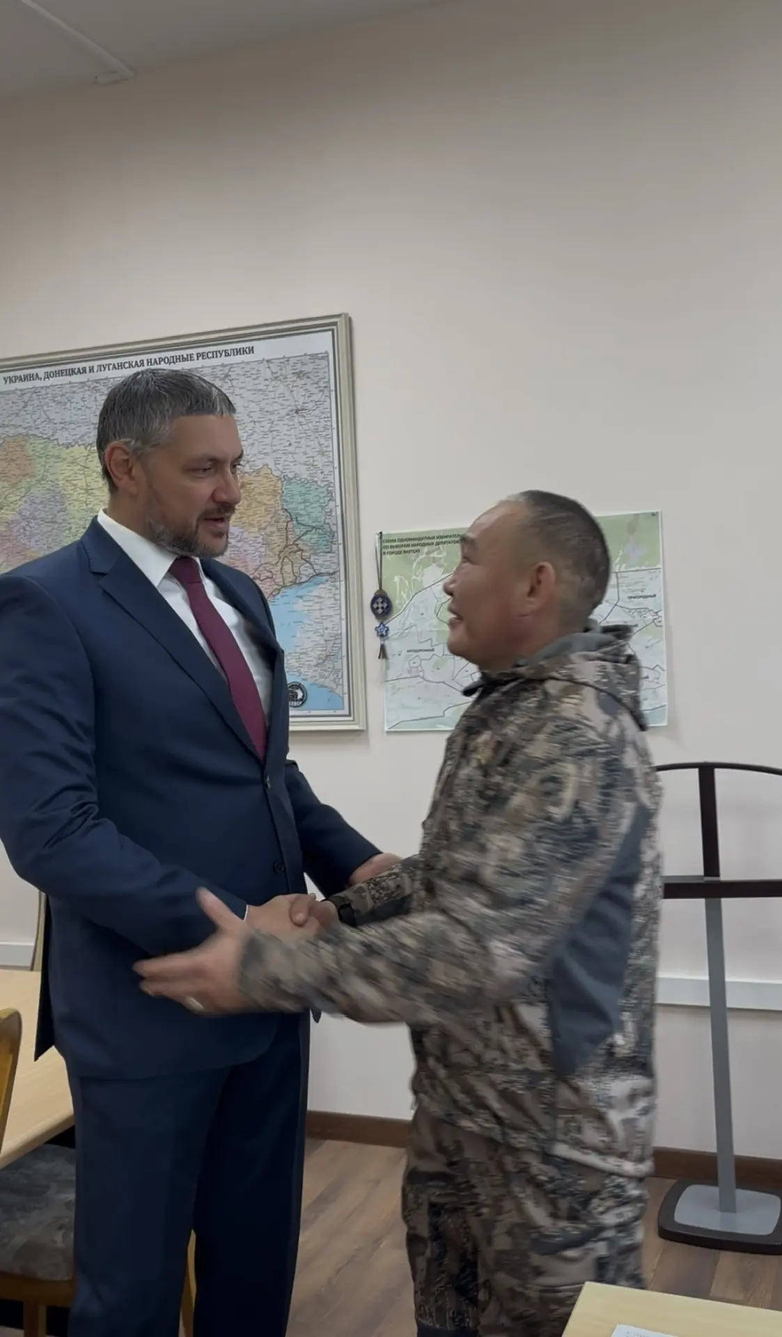 Цырендоржи Мункожаргалову за мужество, отвагу и самоотверженность сына вручили медаль заместитель министра обороны РФ Анна Цивилёва и председатель правления Всероссийского общественного движения «Отцы России» Андрей Коченов. В этот особенный и волнительный момент рядом была жена Анна.