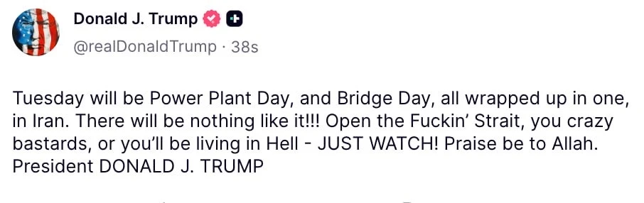 Во вторник в Иране будет “день электростанций” и “день мостов” — всё в одном. Такого ещё не было!!! Откройте чёртов пролив, вы сумасшедшие ублюдки, иначе будете жить в аду — просто смотрите! Хвала Аллаху