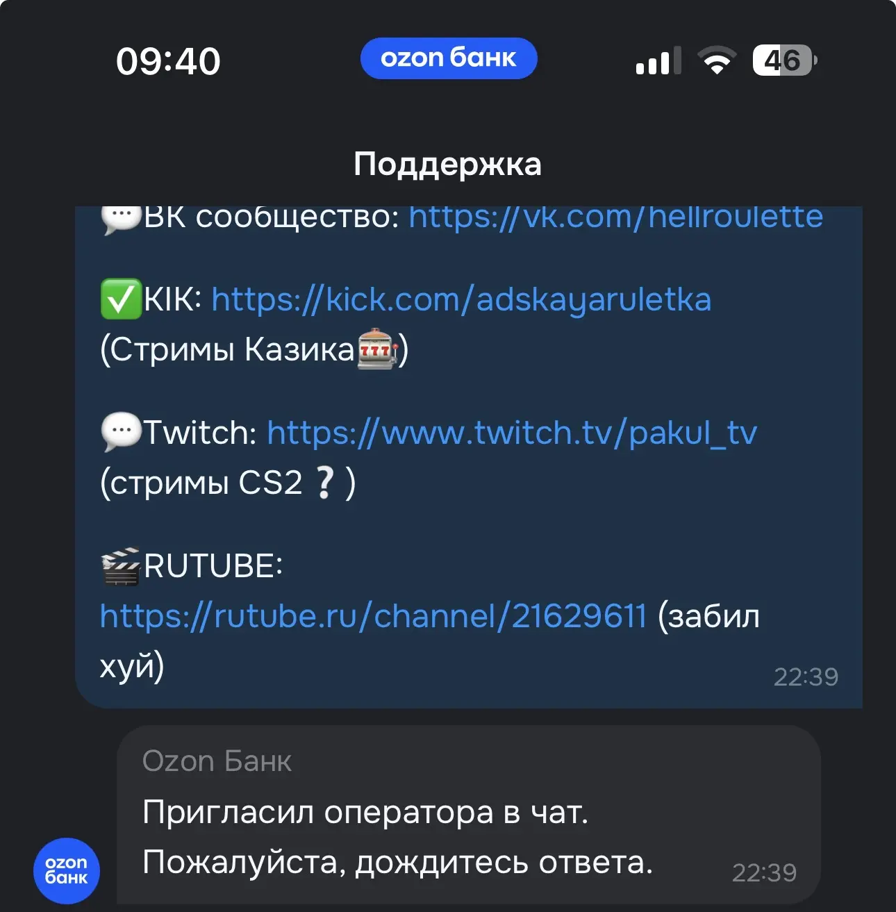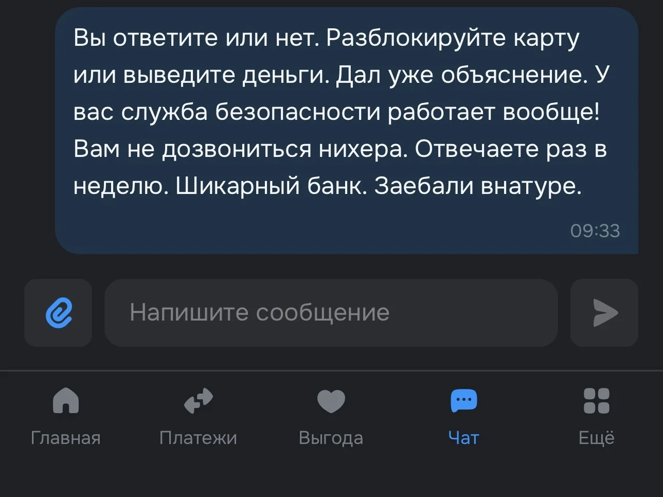 Звонишь, а у них «Ваша карта заблокирована, напишите в чат», пишешь в чат неделю приглашают оператора в чат. Идите на хуй роботы и операторы!