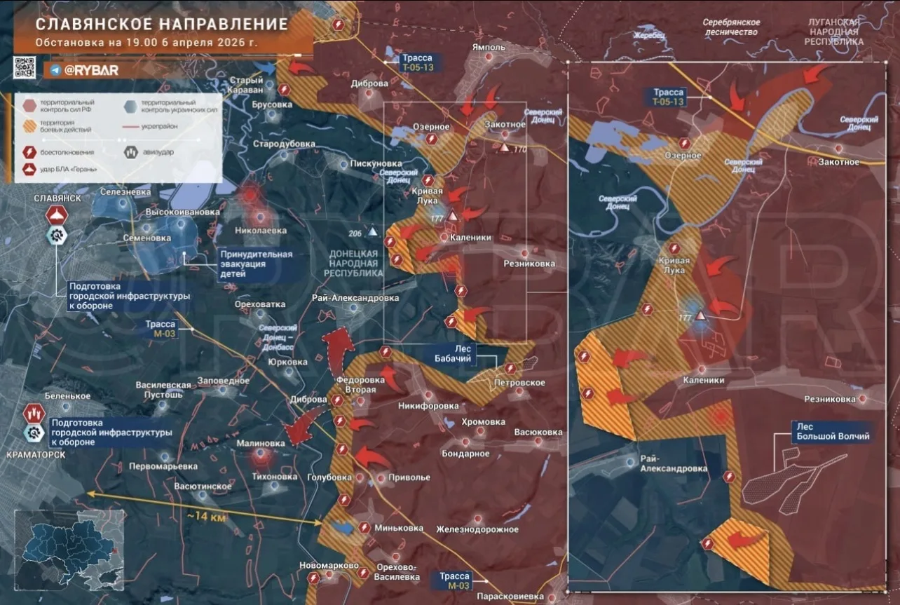 🟥 Краматорско-Славянское направление. По данным ВСУ, российские силы системно бьют по логистике с помощью оптоволоконных дронов, фактически парализуя перемещения техники. Активные действия ведутся в районах Никифоровки, Озерного и на направлении Райгородок — Донецкое, где артиллерия и БПЛА используются для выравнивания линии фронта и подавления украинских позиций (военный «Мучной»).