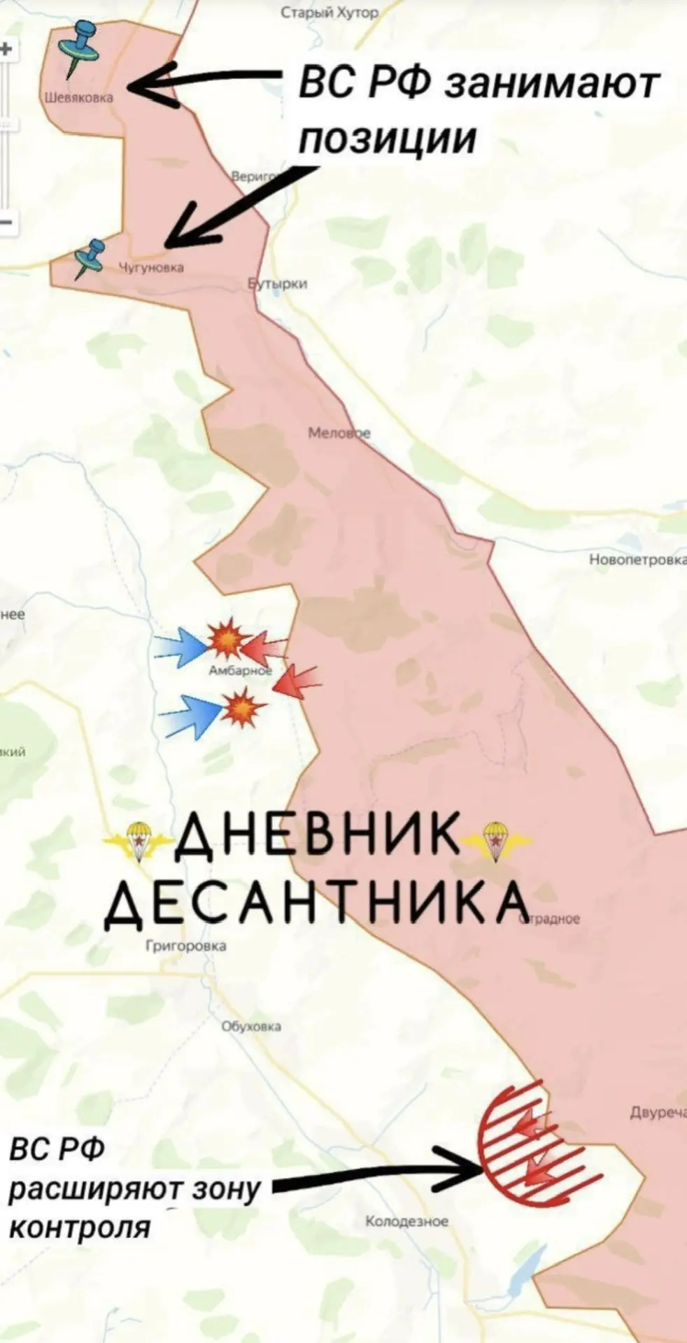 🟥 Также расширяют зону контроля у населенного пункта Колодезное и занимают позиции в районе населённых пунктов Шевяковка и Чугуновка.