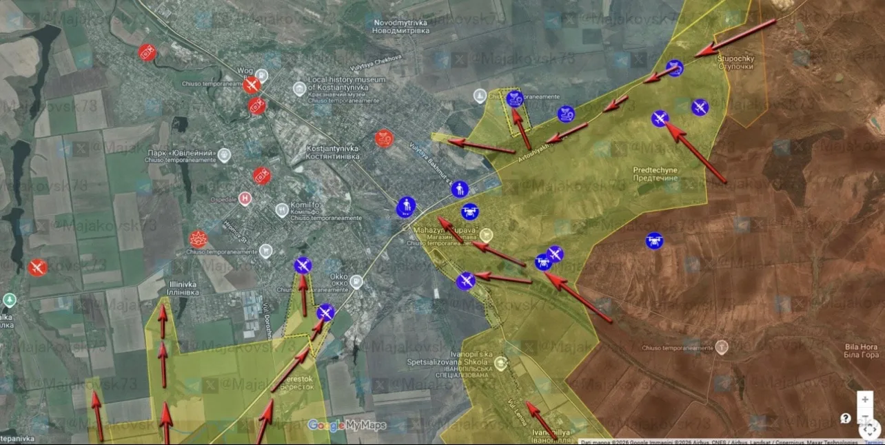 Украинская сторона отмечает ускорение штурма Константиновки после некоторой паузы, взятой РФ. Российские штурмовые группы расширили зону проникновения, продвинувшись в южной части Константиновки к северу от Берестка, а также взвинтили темп на восточном и юго-восточном направлениях.