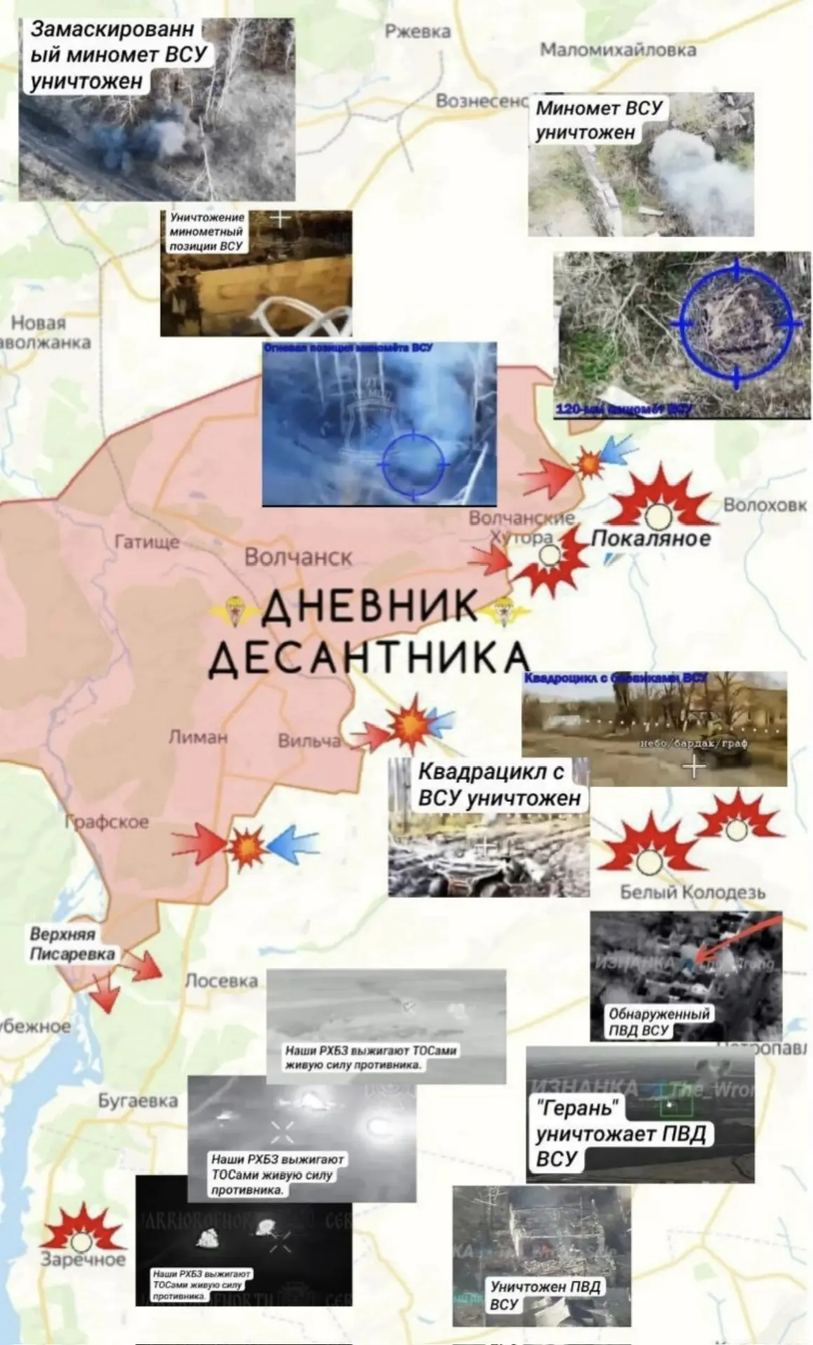 Наши подразделения выбили ВСУ из Верхней Писаревки и продолжают продвигаться в лесной зоне в направлении Лосевки и Бугаевки. Бои идут у окраин Вильчи и в центральной и восточной частях Волчанских Хуторов, где противник постоянно контратакует по балкам со стороны Белого Колодезя. Восточнее Волчанских Хуторов ВС РФ ведут бои за Бочково и Охримовку.