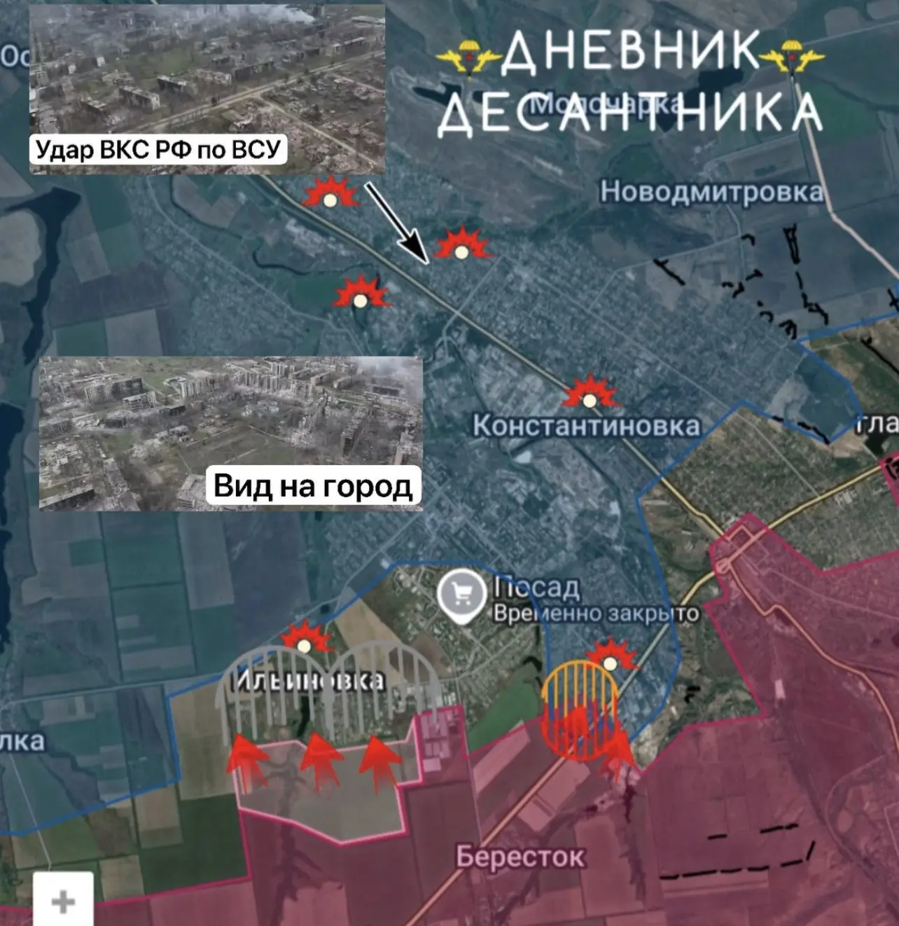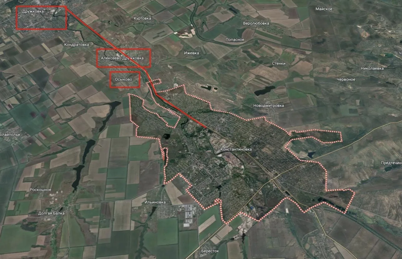 Основная зона поражения сосредоточена на северной окраине Константиновки, в районе Осыково и Алексеево-Дружковки, при этом всё чаще удары наносятся ещё севернее — в районе Дружковки. Российские беспилотники различных модификаций непрерывно патрулируют центральную дорогу, поражая любые цели: от небольших групп пехоты до грузового автотранспорта. Ожидается, что ситуация продолжит неуклонно ухудшаться с предсказуемыми для гарнизона последствиями.