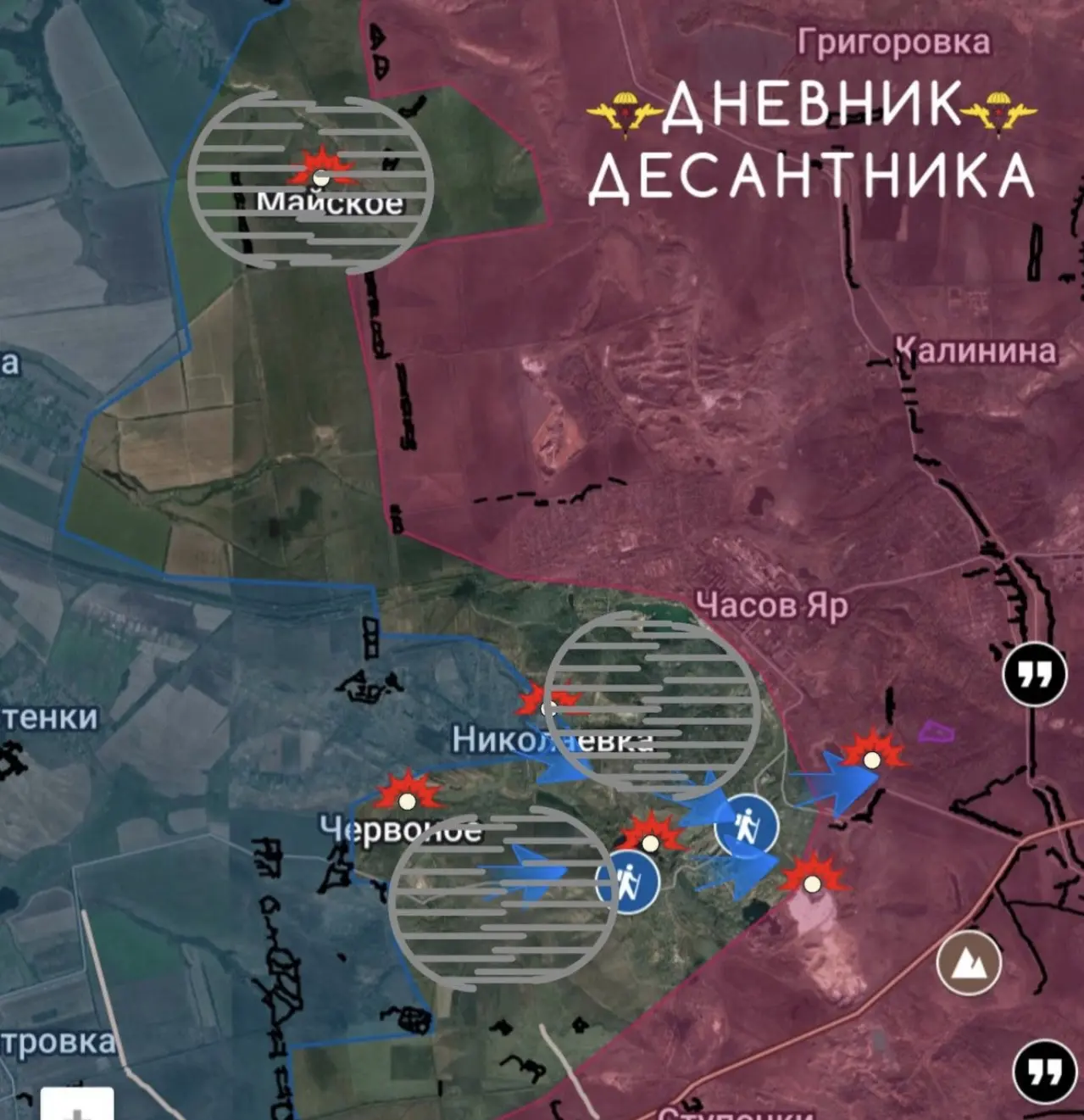 ▫️Чуть севернее в районе Майского идут позиционные бои, само село в серой зоне, закрепиться в нем не удается.