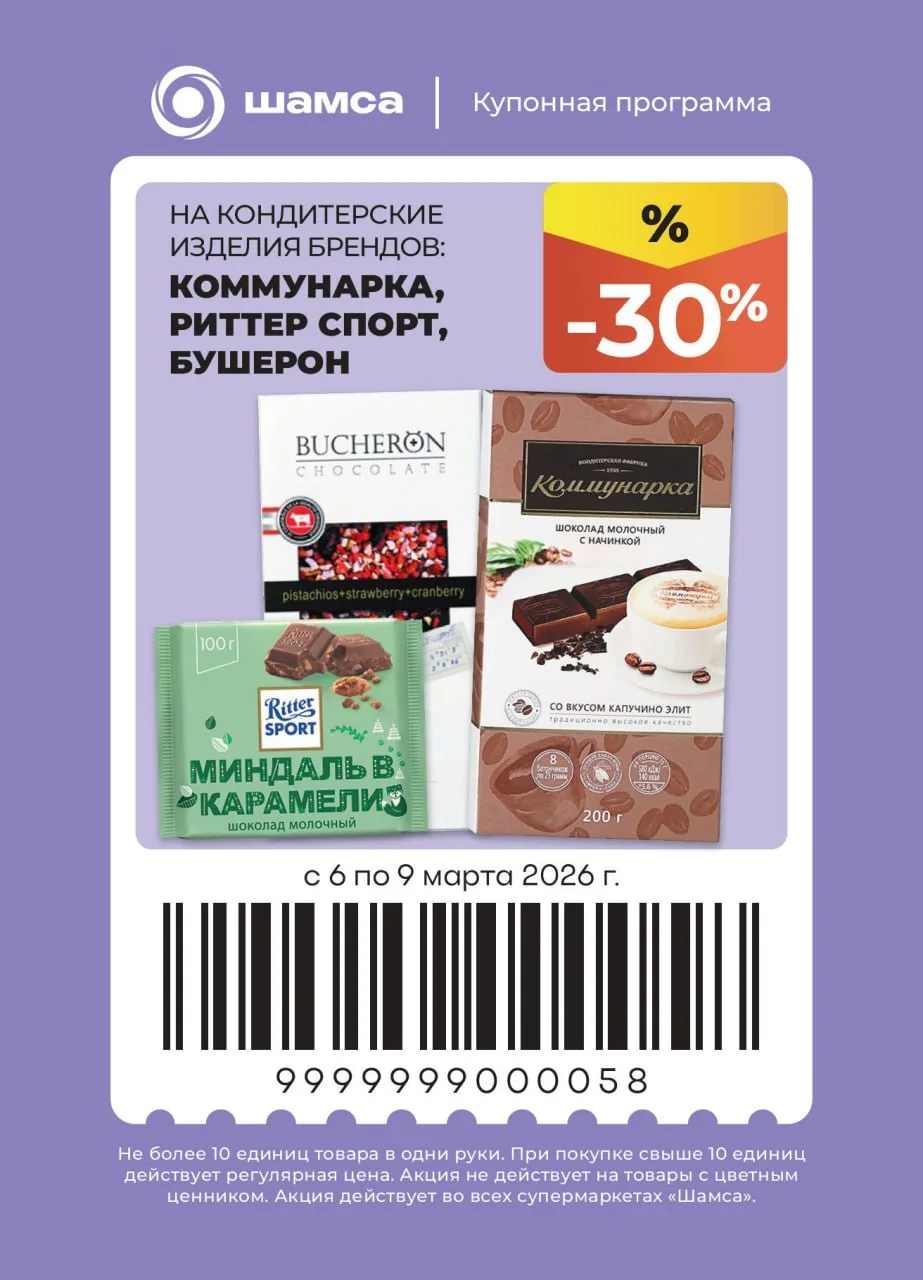 🍫 Второй купон — на кондитерские изделия брендов Коммунарка, Риттер спорт, Бушерон.
