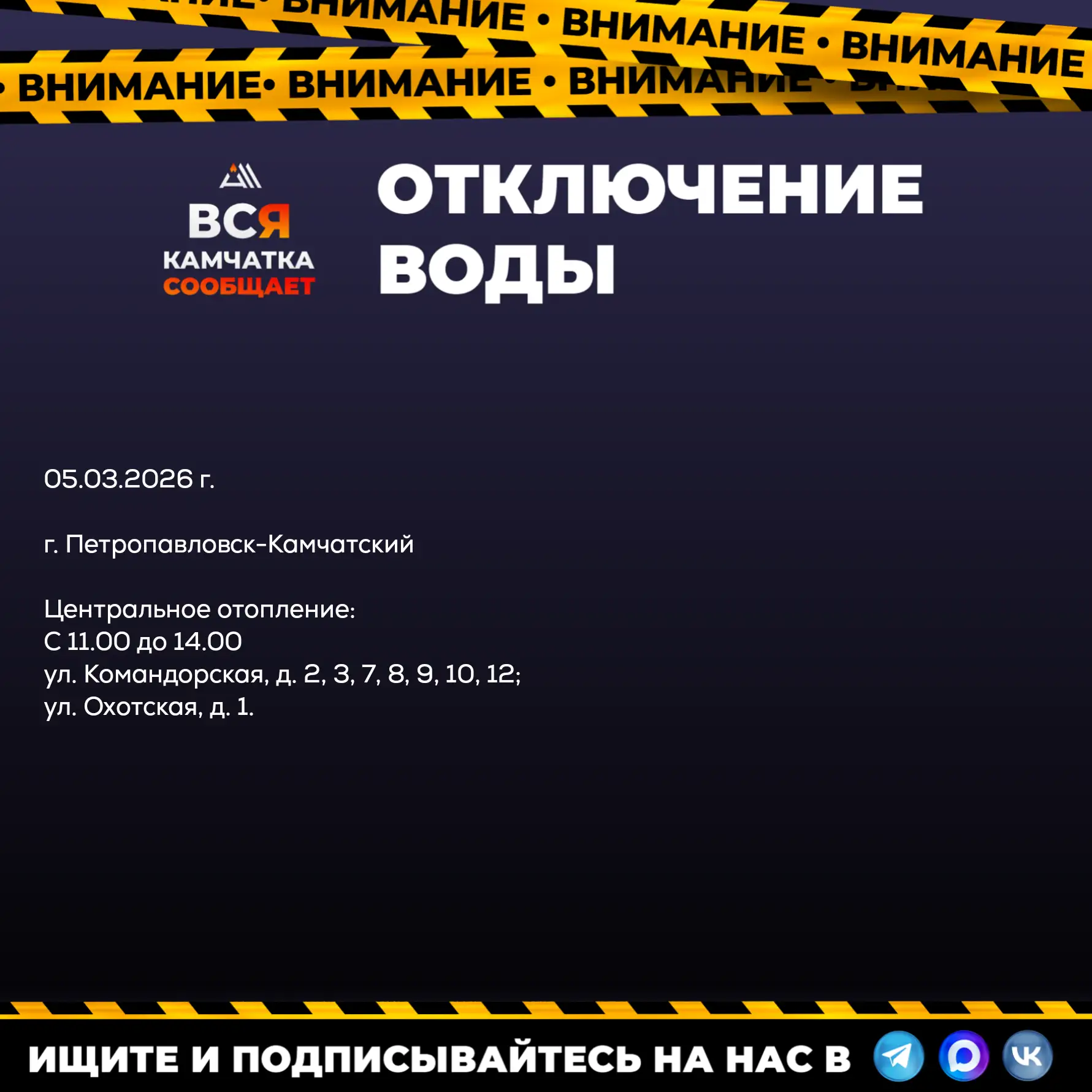 ВНИМАНИЕ, отключение центрального отопления на 05.03.2026 г.