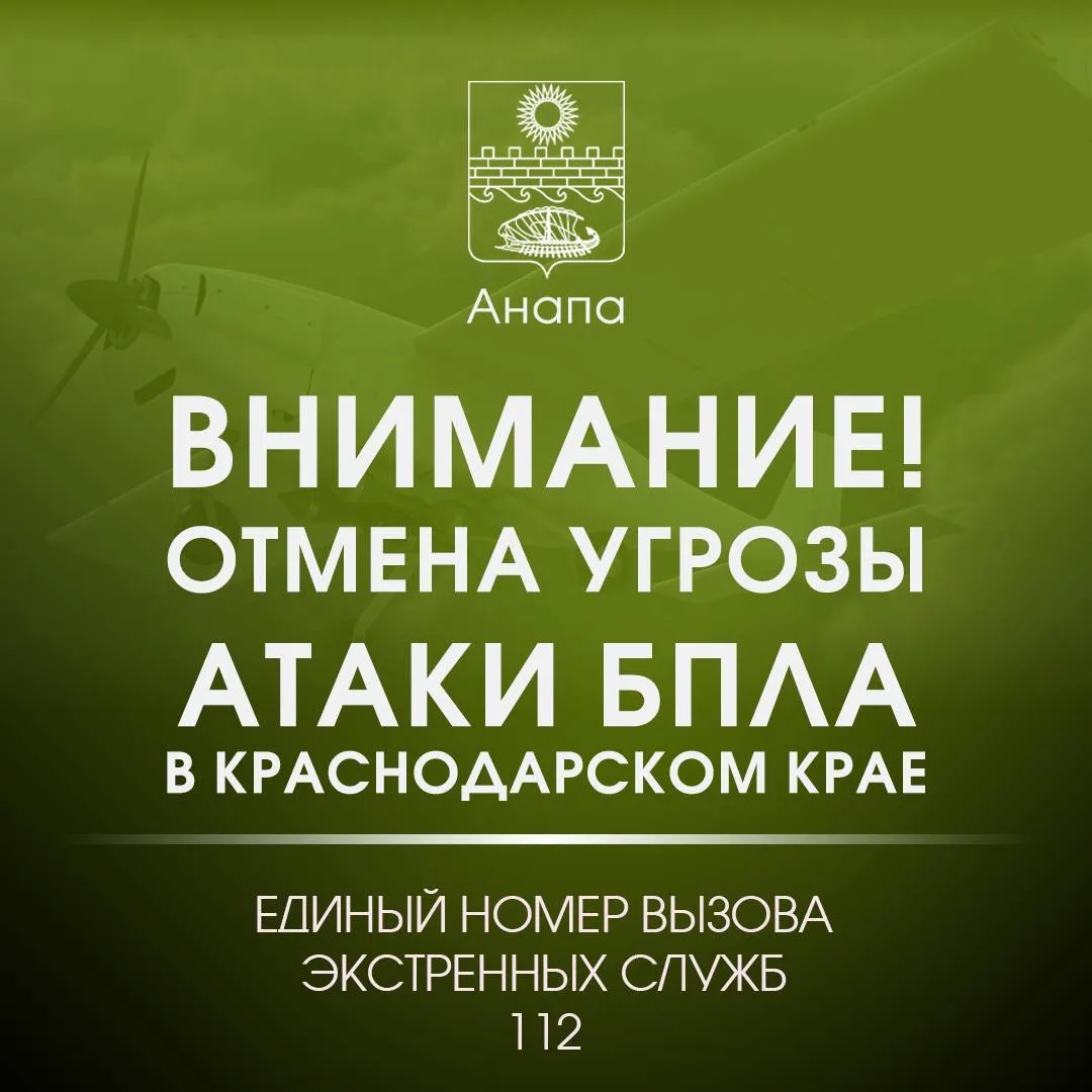 📢Внимание! Отмена сигнала «Атака БПЛА в Анапе»