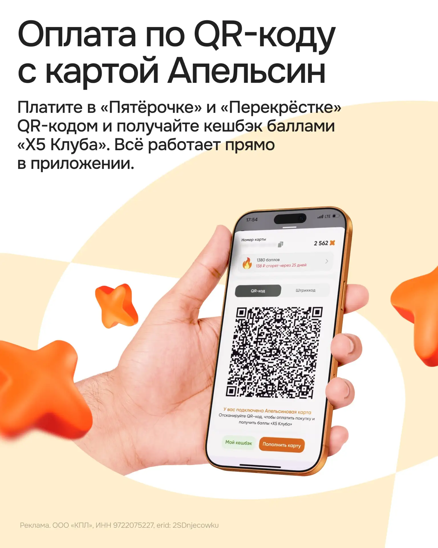 Пока все живут в 2025 году, владельцы бесплатной Апельсиновой карты уже открыли для себя будущее — удобную и быструю оплату по QR-коду в «Пятёрочке» и «Перекрёстке».