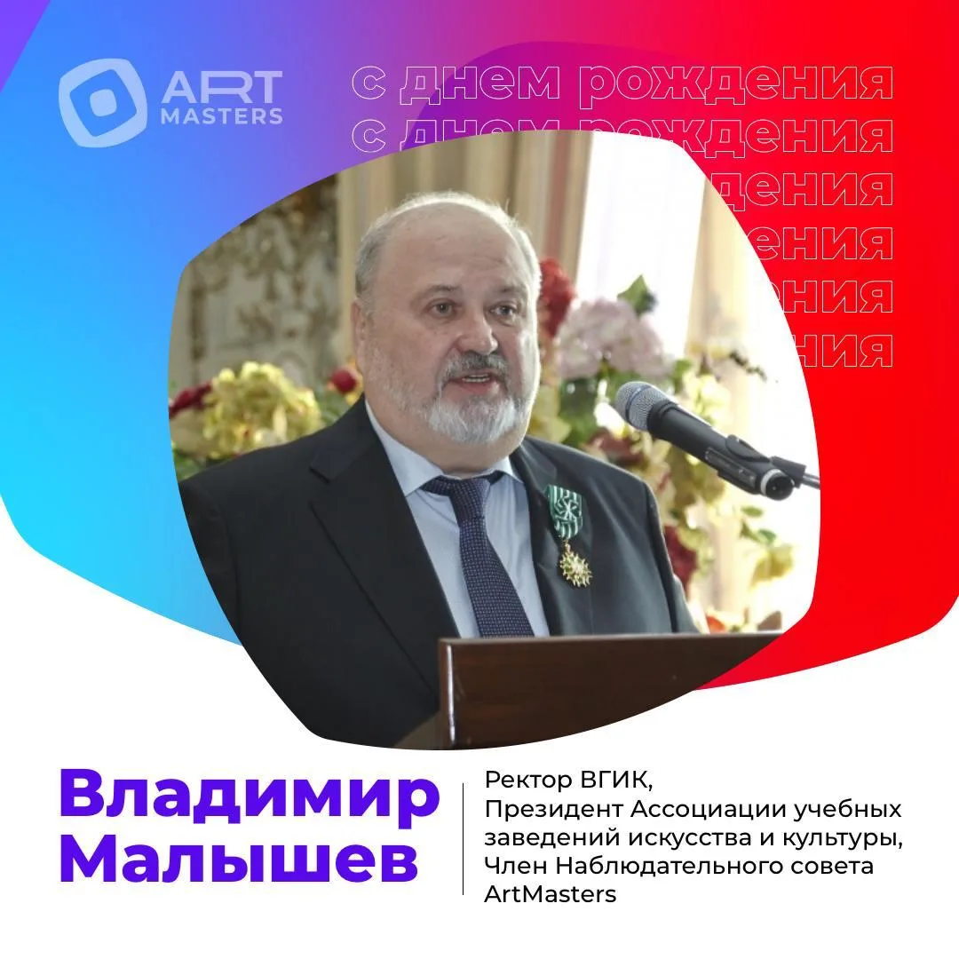 Сегодня свой день рождения отмечает ректор ВГИК имени С.А. Герасимова, Президент Ассоциации учебных заведений искусства и культуры, член Наблюдательного совета ArtMasters Владимир Малышев.
