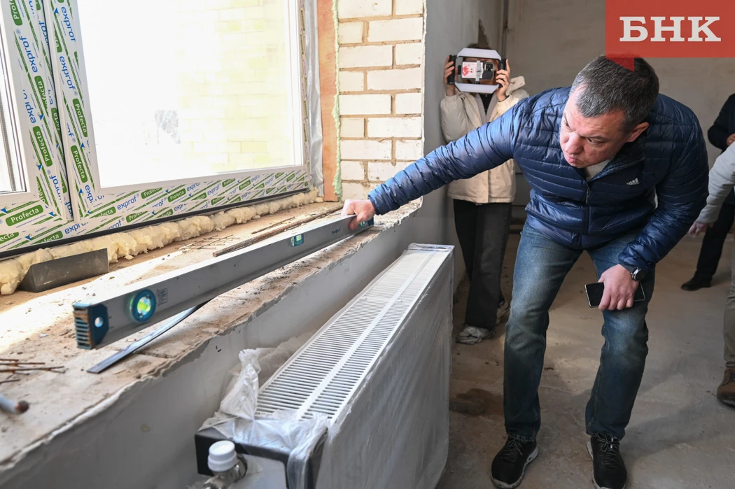 Руководитель республики лично решил проверить, насколько ровно были поставлены окна, потребовав у строителей уровень. Также он обратил внимание подрядчика на отваливающуюся штукатурку и посоветовал простукивать стены.