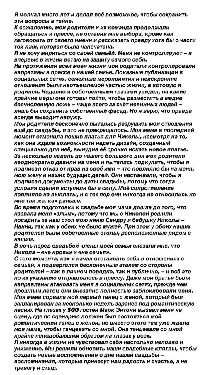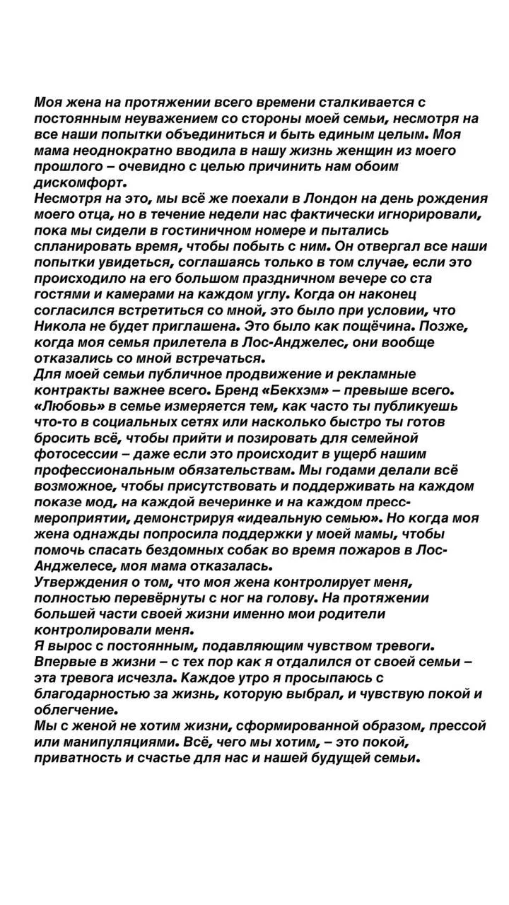 У себя в запрещеннограме старший сын Дэвида и Виктории выдал огромную тираду: родители, оказывается, совсем не идеальные. Контролировали его образ , врали в СМИ, давили на него и даже финансово шантажировали. А Виктория еще и подгадила на свадьбе: отменила пошив платья невесты, вышла на танец с женихом первее невесты и приглашала бывших девушек сына на общие мероприятия.