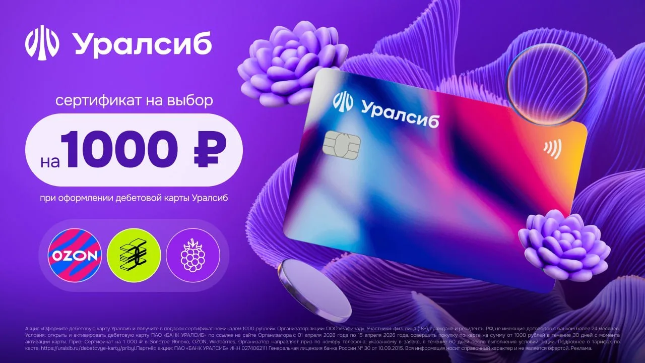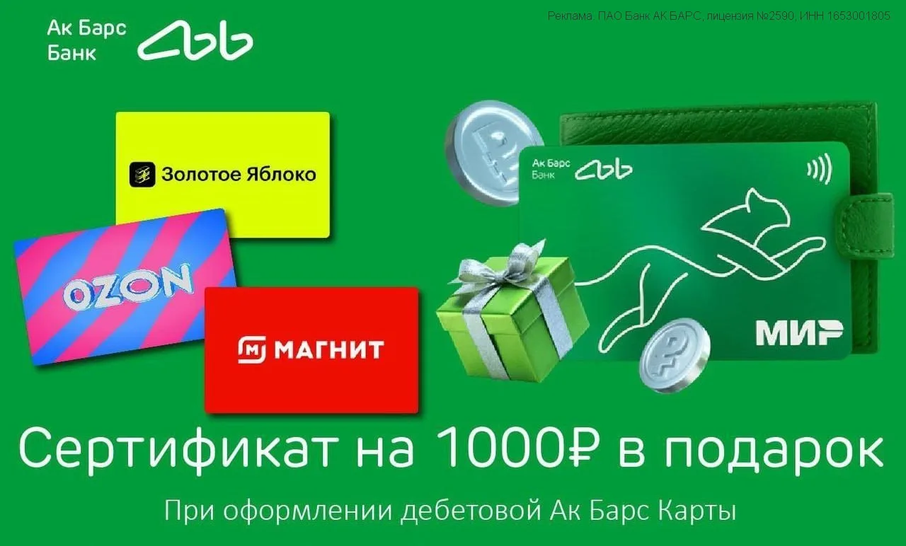 ⚡ Ак Барс продлил акцию для новых клиентов: оформляем бесплатную дебетовую карту на этой странице → тратим от 1000₽ за 30 дней — и получаем сертификат на 1000₽ в Золотое Яблоко, Магнит или Ozon на выбор. Акция работает до 30 апреля. Правила