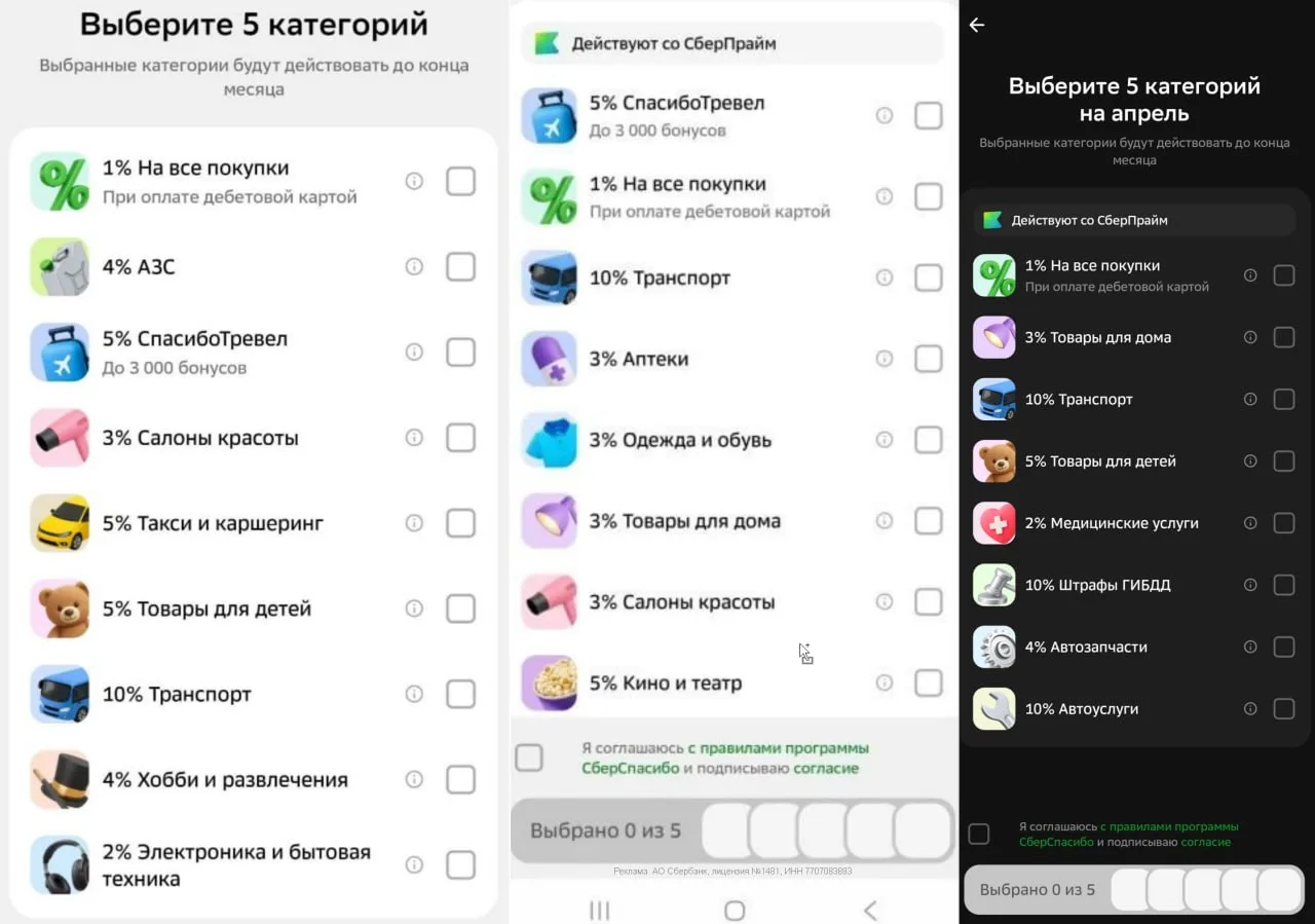 🔘Владельцам обычной СберКарты (а также Standard/Gold/Classic) дают выбрать 3 категории. Лимит — 2000 бонусов.