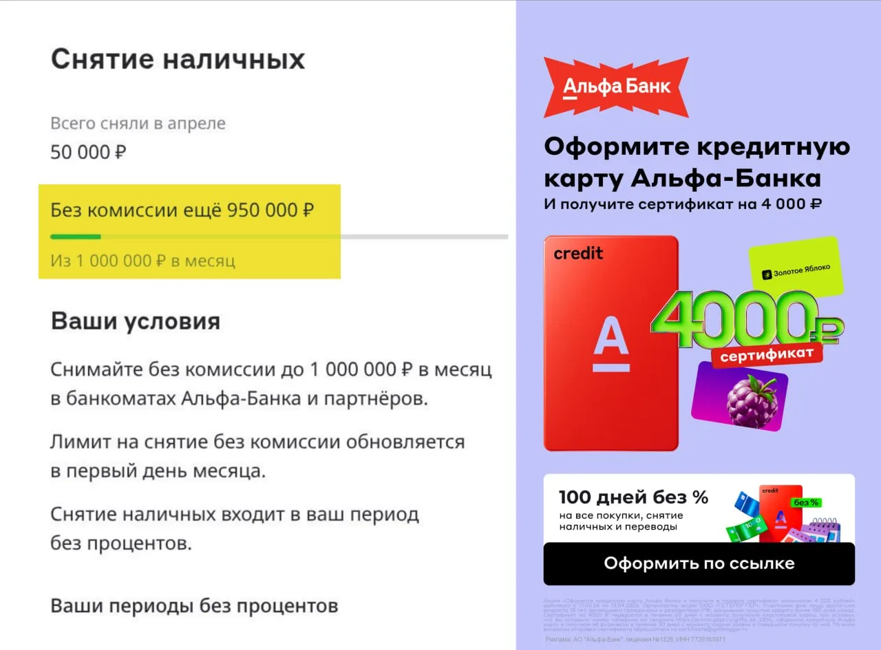⚡ У некоторых клиентов Альфы в приложении по кредитке отображается лимит снятия наличных без комиссии — 1 млн. ₽. Это ошибка, поддержка подтвердила. Реальный лимит — 50к в месяц без комиссии и процентов в любых банкоматах.