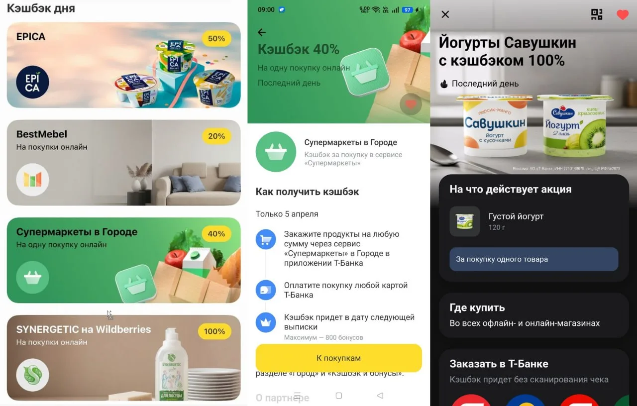 💳 Т-Банк: кэшбэк дня — 100% на лимонады Река в Перекрёстке, Магните, Азбуке Вкуса, Мираторге (макс. 200), 100% на кабачковую икру в Городе (макс. 200), 50% на йогурт EPICA (макс. 80 бонусов), 55% на доставку из Перекрёстка от 1000₽ (макс. 600), 40% на Супермаркеты в Городе (макс. 600), 30% на Вкусно — и точка для новых клиентов (макс. 250). Может быть не у всех.