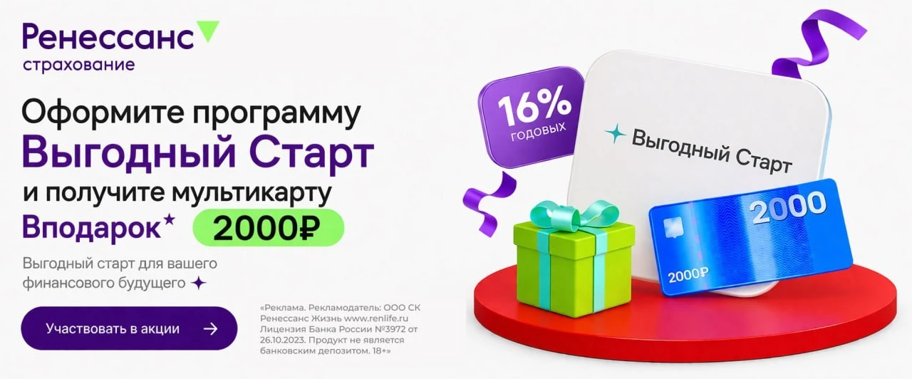 ⚡ Ренессанс Жизнь запустила акцию по НСЖ «Выгодный старт» (бывший Смарт Плюс) — при оформлении по этой ссылке дают подарочный сертификат Мультикарта на 2000₽.