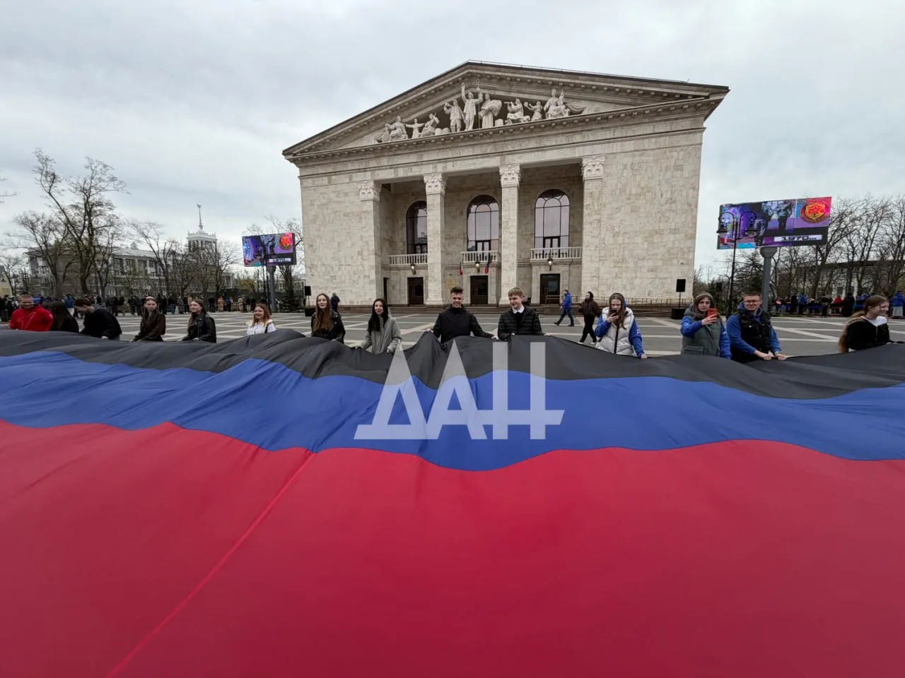 Под композицию «Донбасс за нами», которую вживую исполнила заслуженная артистка ДНР Маргарита Лисовина, активисты «Молодой Гвардии» ДНР растянули республиканский триколор в 12-ю годовщину со Дня провозглашения ДНР.