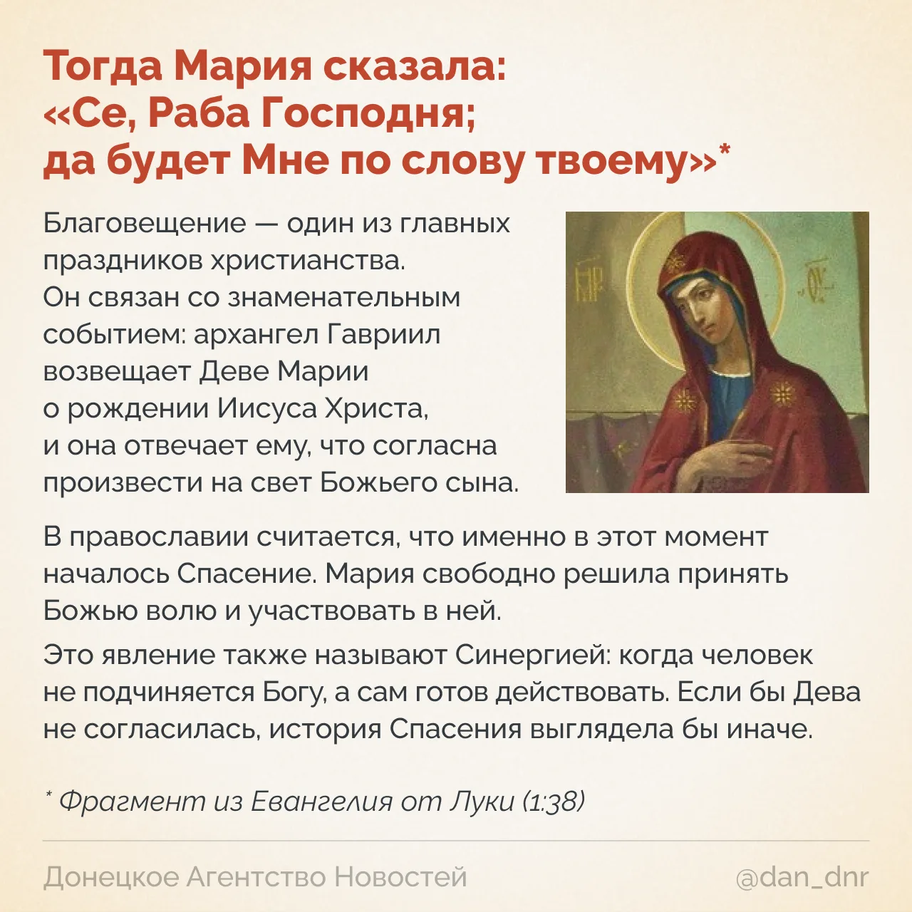 Такой настрой связан с самим смыслом праздника: Благовещение — это момент встречи воли Бога и свободного ответа человека, поэтому важно уделить внимание своему внутреннему состоянию и быть внимательнее к незримому присутствию Бога рядом с нами.