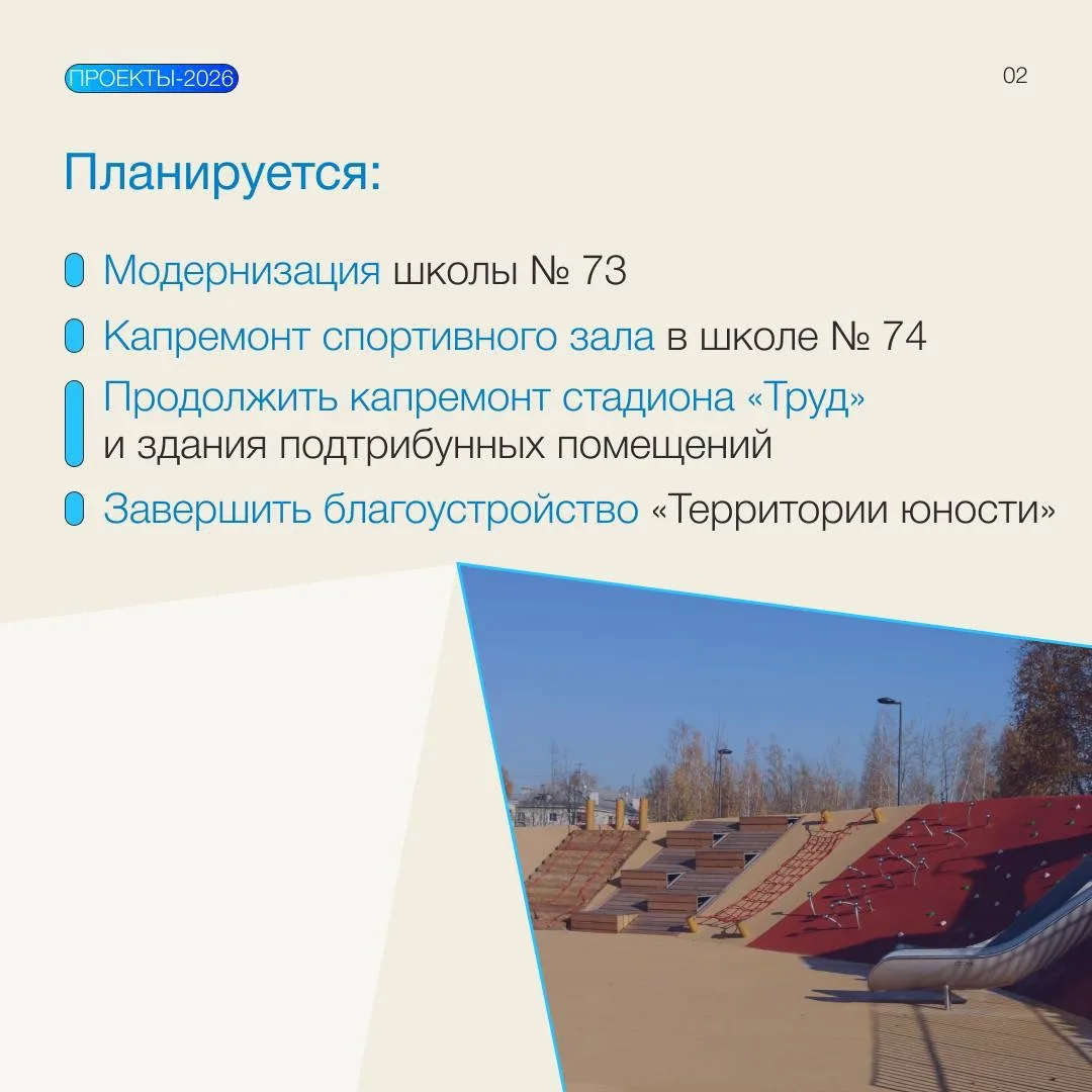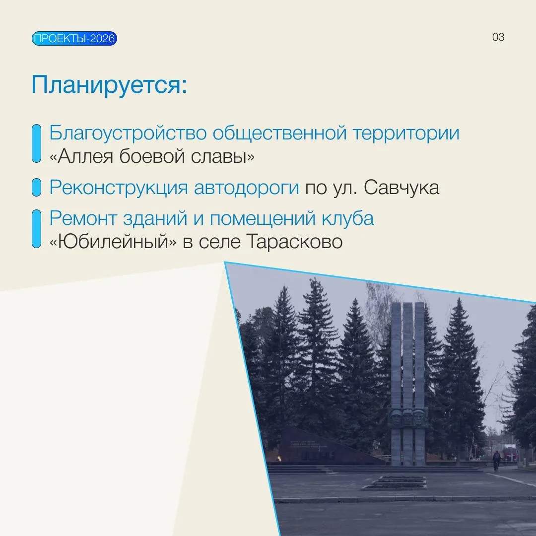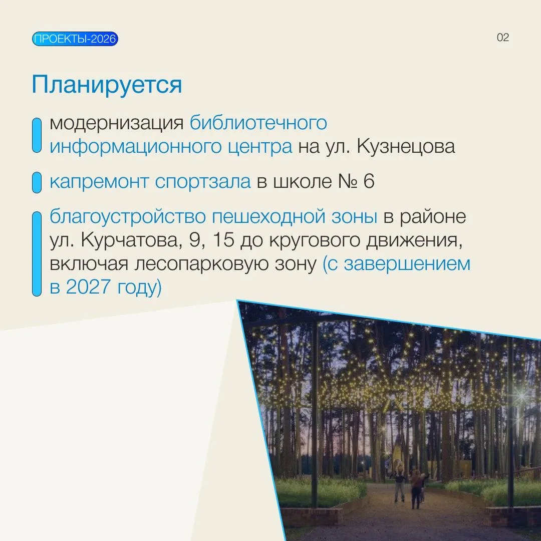 Кроме того, в 2026 году завершим благоустройство сквера «Танцевальный» и в рамках нацпроекта «Инфраструктура для жизни» продолжим ремонт автодорог.