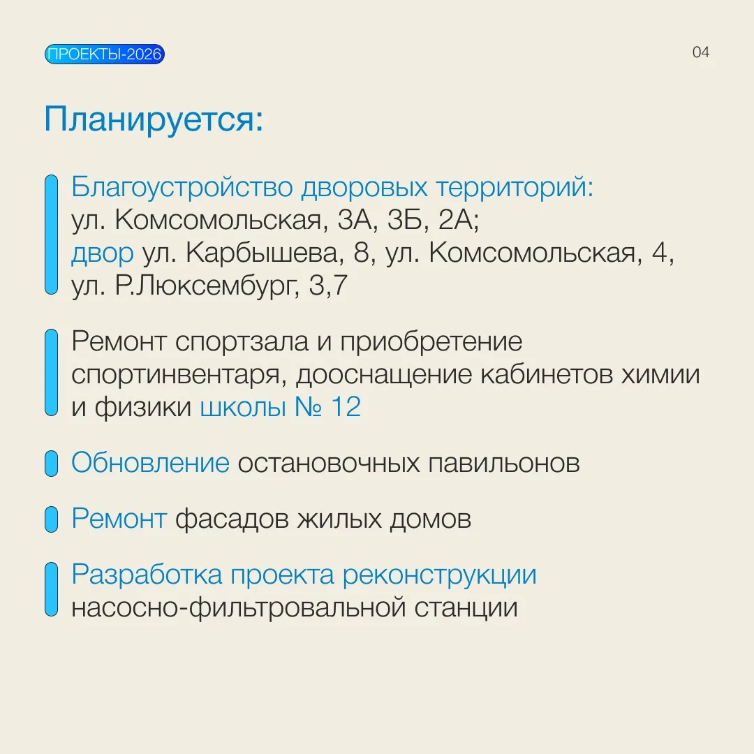 В информационных карточках — проекты, которые запланированы к реализации в Нижнем Тагиле, городе трудовой доблести и втором по численности населенном пункте Свердловской области.