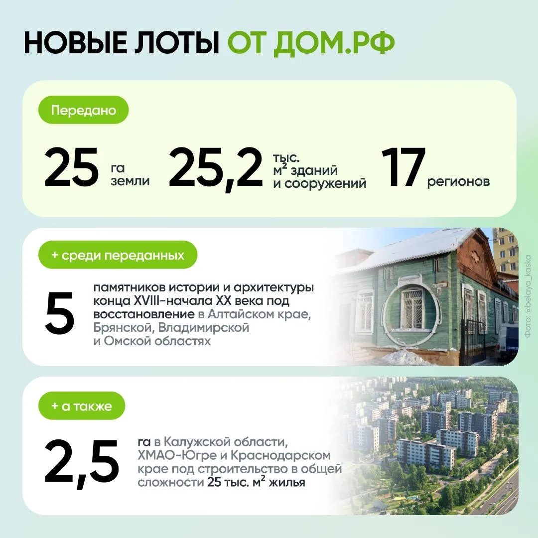 Ещё 27 га земли и 25 тысяч м² зданий. ДОМ.PФ получил в управление неиспользуемые участки и недвижимость в 17 регионах — всё это позже предложим инвесторам на торгах.