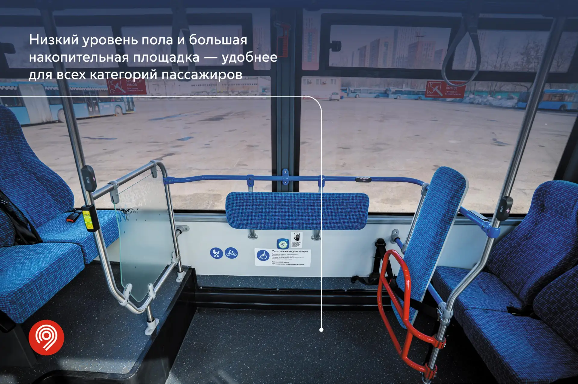 🔹 Теперь каждый автобус низкопольный, с удобным входом и выходом во все двери. Есть крупная накопительная площадка для перевозки маломобильных пассажиров.