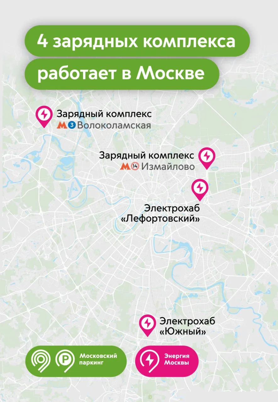 Ещё есть два зарядных хаба на 20 быстрых ЭЗС — "Лефортовский" и "Южный". Они построены ПАО "Мосэнерго" в партнёрстве с Дептрансом.