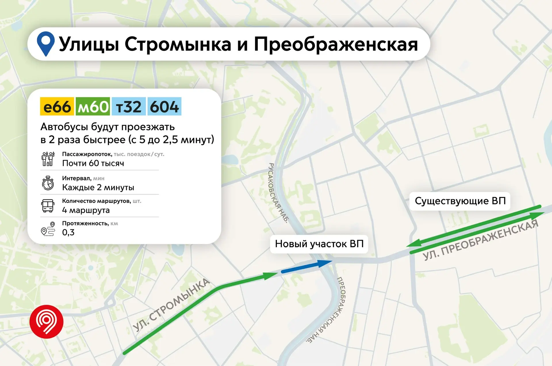 🔹 Улицах Стромынка и Преображенская. Автобусы проезжают этот участок в 2 раза быстрее.