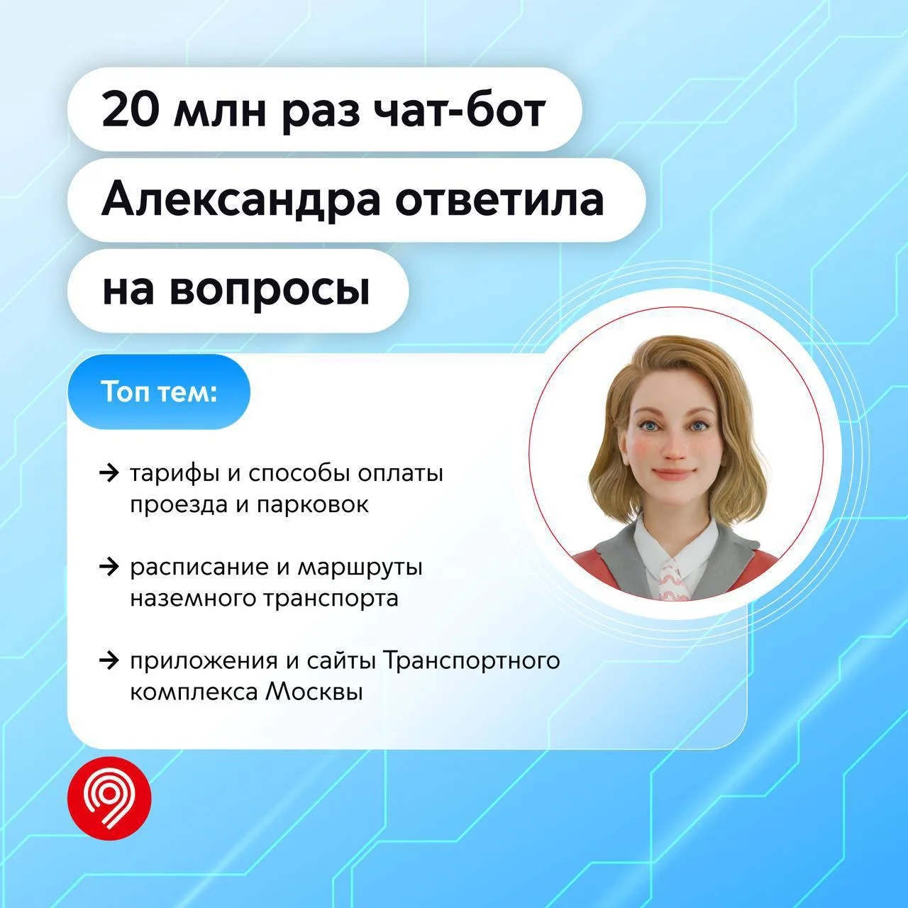 «Сегодня каждое 3-е обращение по вопросам работы транспорта поступает в чат-бот. 60% базы знаний виртуального ассистента подключено к искусственному интеллекту. Это позволяет Александре отвечать на большее число вопросов различной степени сложности. Теперь пользователи могут быстро получить всю необходимую информацию о транспорте на новой площадке в привычном и удобном формате. В соответствии со Стратегией развития транспорта до 2030 года, которую утвердил Мэр Москвы Сергей Собянин, мы продолжим внедрять ИИ в наши сервисы и повышать комфорт пассажиров», — добавил Максим Ликсутов.