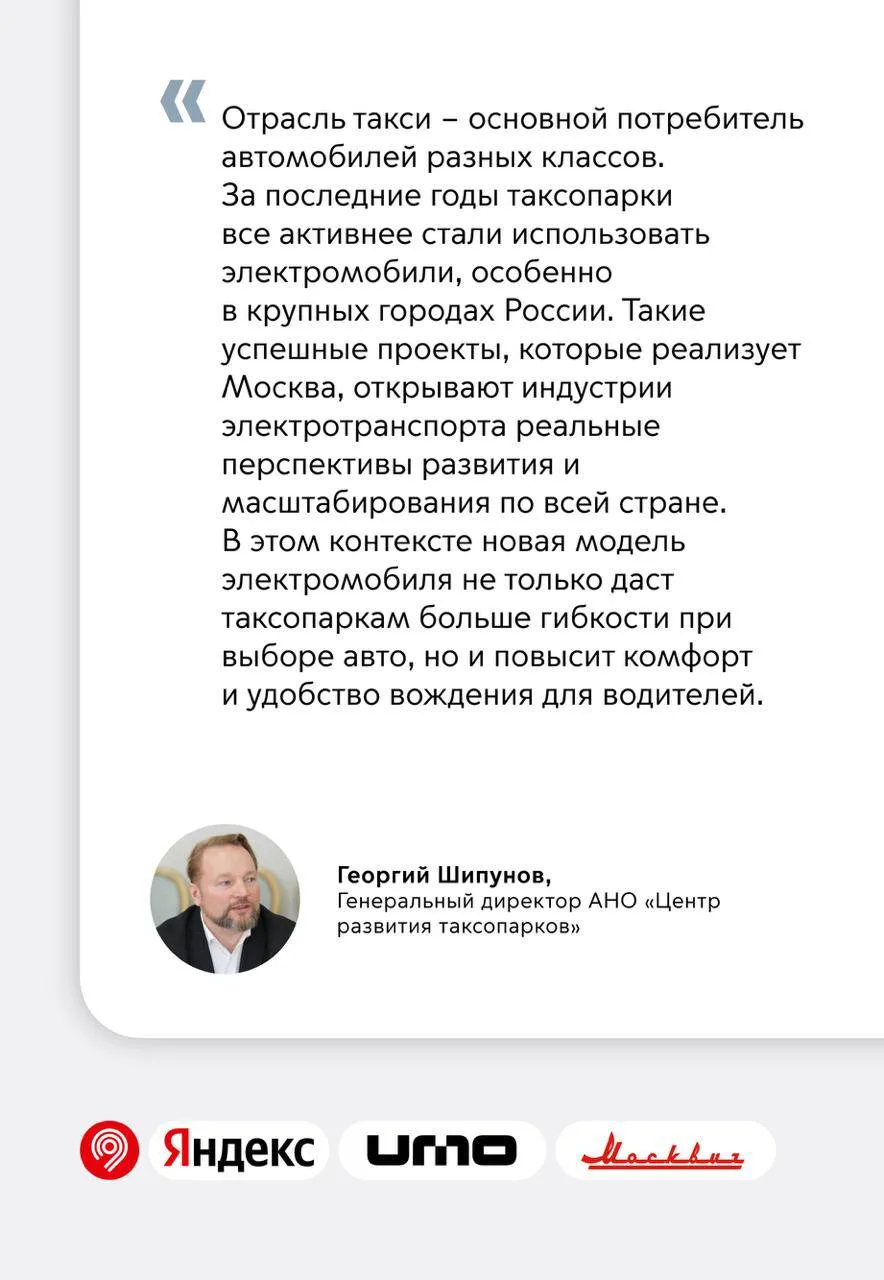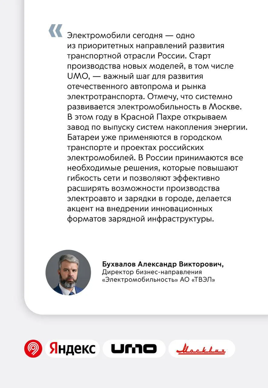 «Развитие собственного высокотехнологичного производства — это залог не только экономического роста, но и обеспечения технологического суверенитета нашей страны. Москвичи уже скоро смогут оценить комфорт и экологичность отечественного электрокара. Первые 100 машин новой модели передадим столичным таксопаркам. В дальнейшем UMO будет доступен розничным клиентам, в том числе через дилерскую сеть завода. До конца года планируем выпустить свыше 3 тыс. таких электромобилей», — добавил Максим Ликсутов.