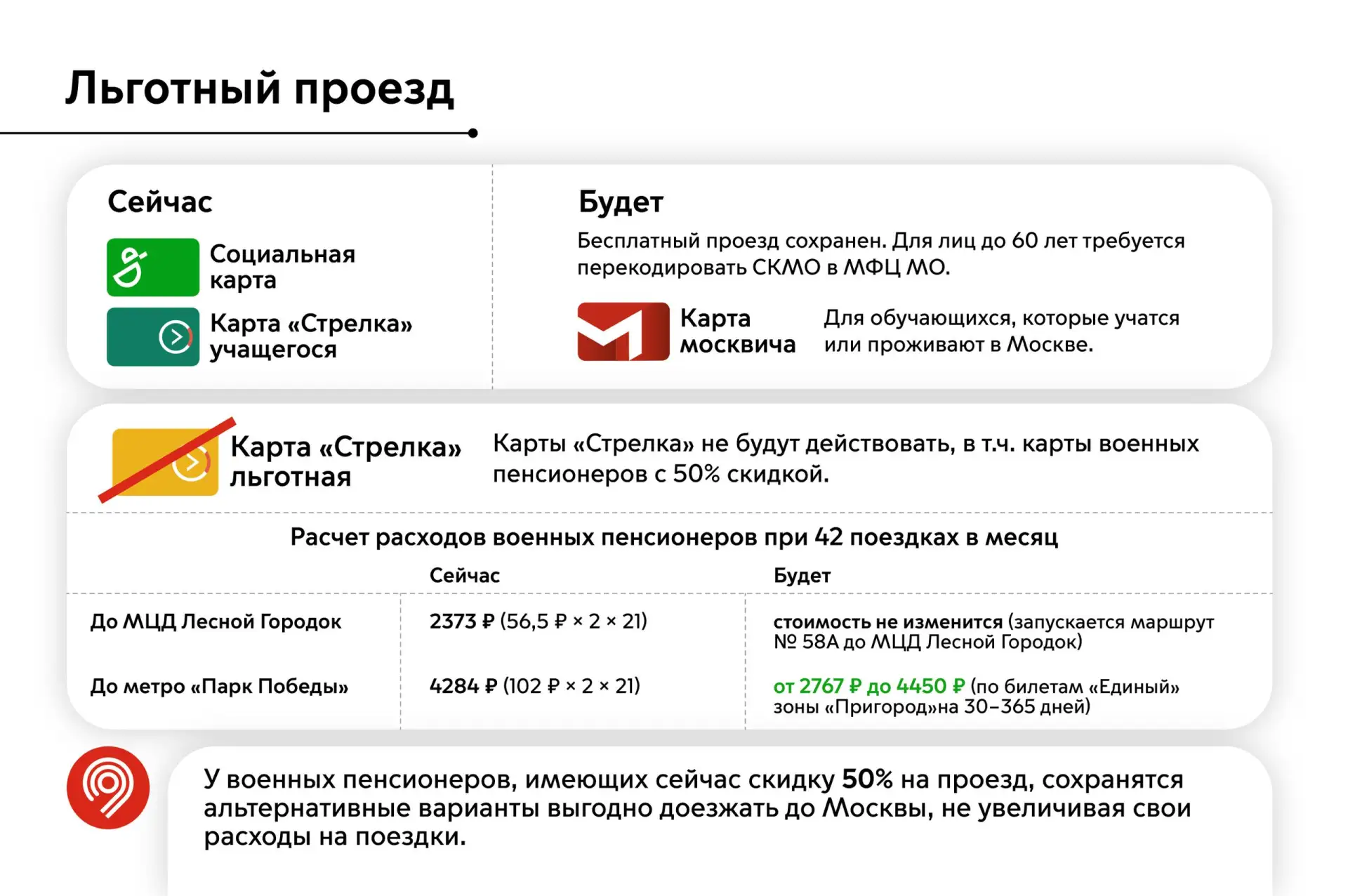 🔹 Сохранили все льготы для пассажиров, которые используют социальные карты москвича и жителя Московской области. Если карта жителя Московской области не срабатывает, ее нужно перекодировать в МФЦ на территории Подмосковья.