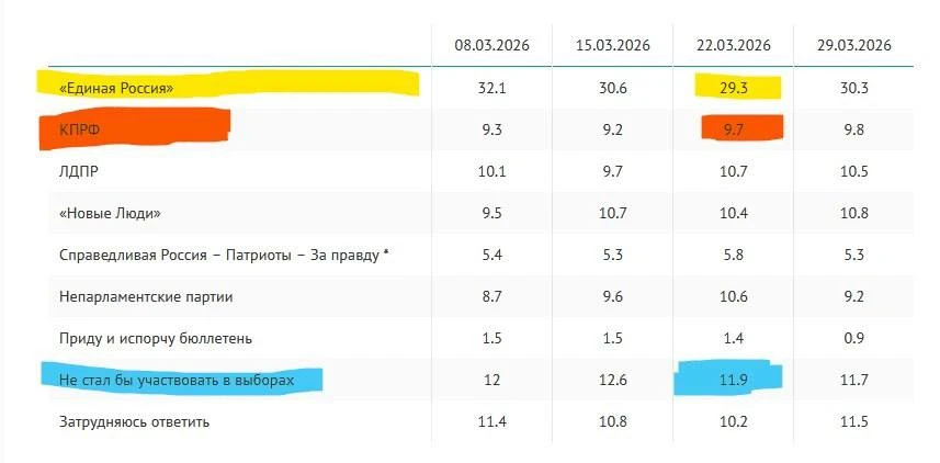 Одна из обсуждаемых тем в политических пабликах и экспертных сообществах – исследования ВЦИОМ о рейтингах политических партий. Согласно результатам последнего опроса (19-22 марта 2026 года) уровень электоральной поддержки «Единой России» опустился ниже критической отметки в 30%, достигнув 29,3%.