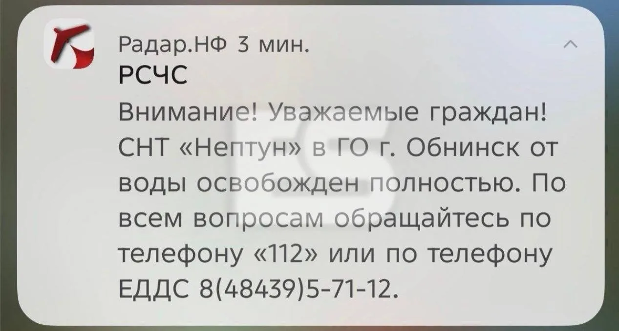 Обнинцев оповещают об освобождении СНТ «Нептун» от воды. Паводок отступил.