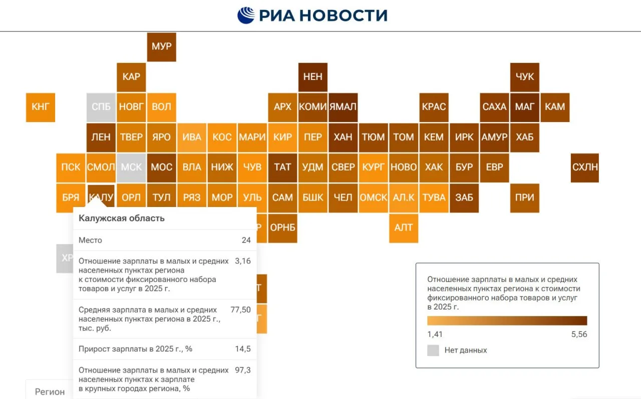 По итогам 2025 г. Калужская область заняла 24-е место по уровню зарплат в малых и средних городах России – по оценкам аналитического центра РИА «Новости».