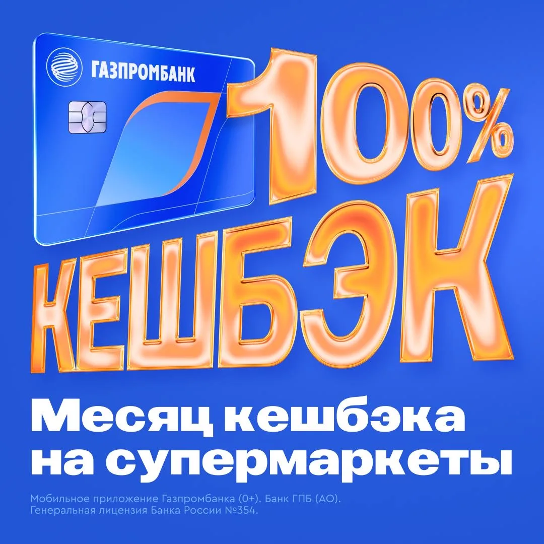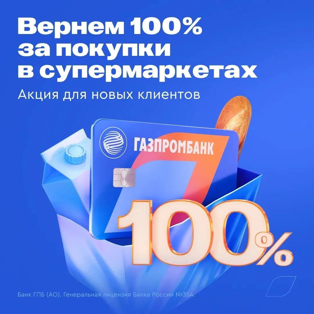 Покупайте продукты в любимых супермаркетах и возвращайте 100% от суммы покупки. Акция для новых клиентов Газпромбанка.