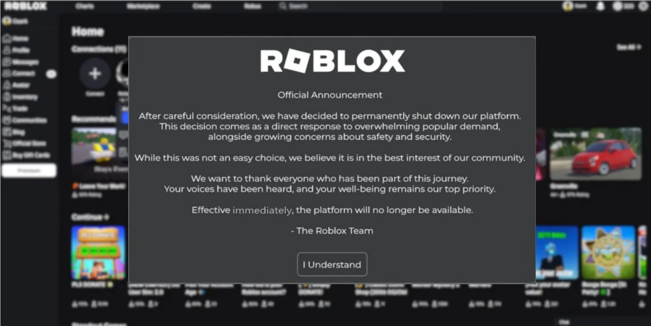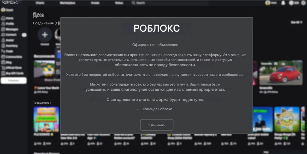 У некоторых пользователей сегодня при входе на сайт вылезли сообщения о закрытии платформы роблокс (а может и нет).