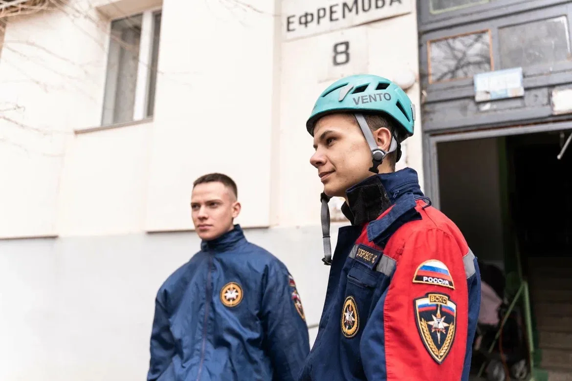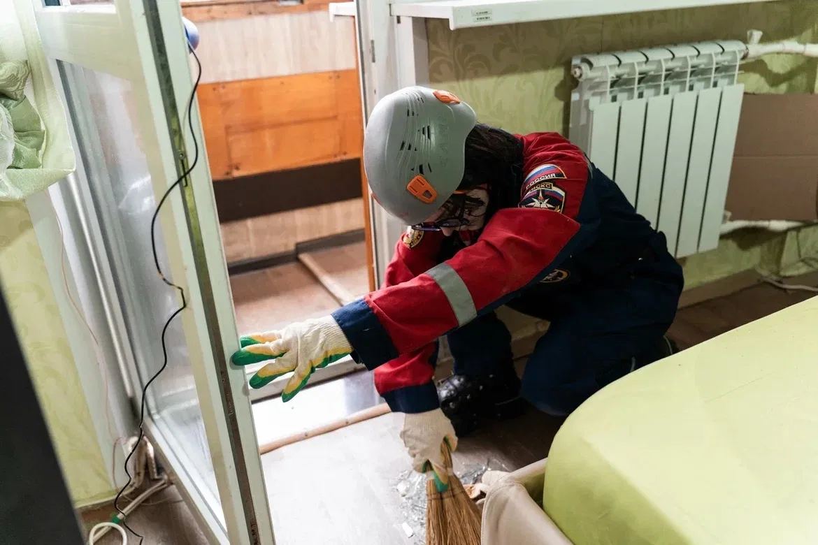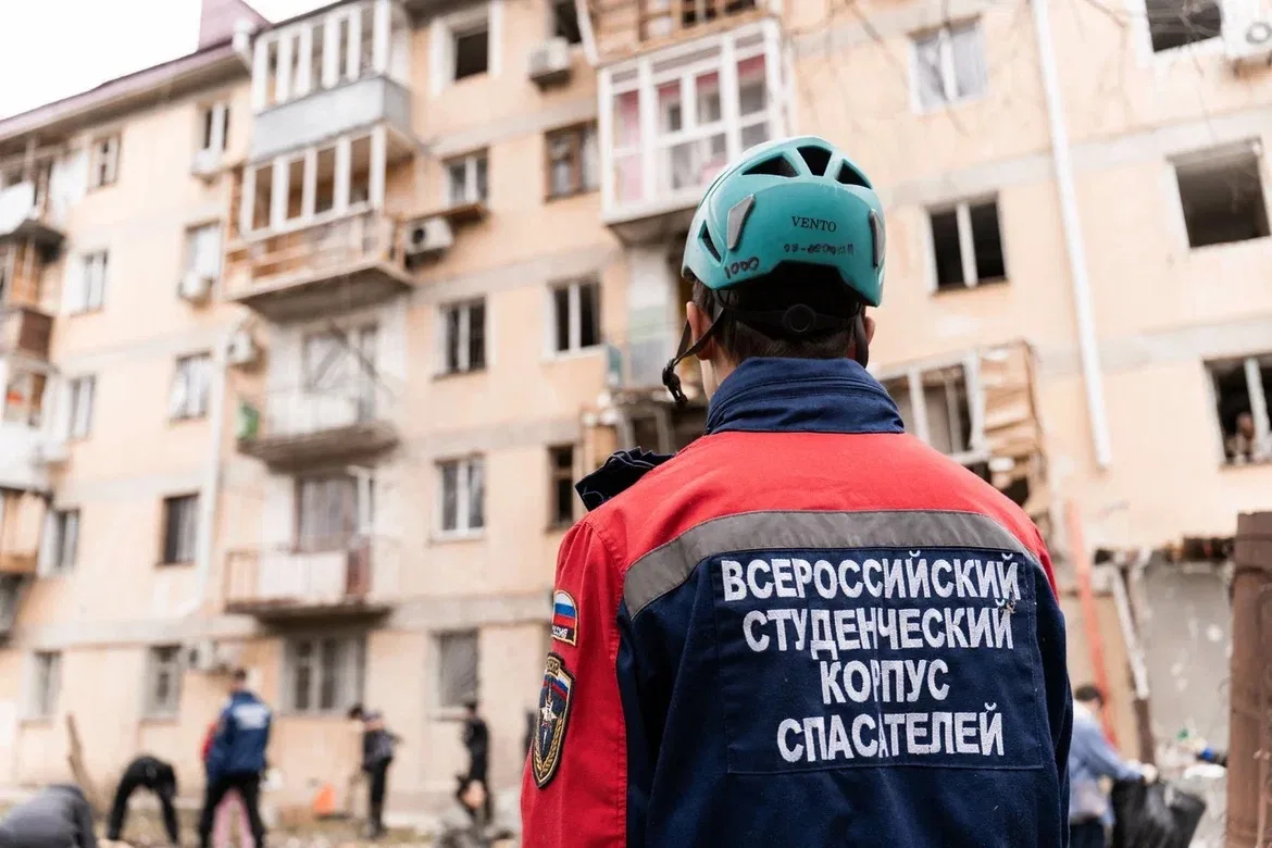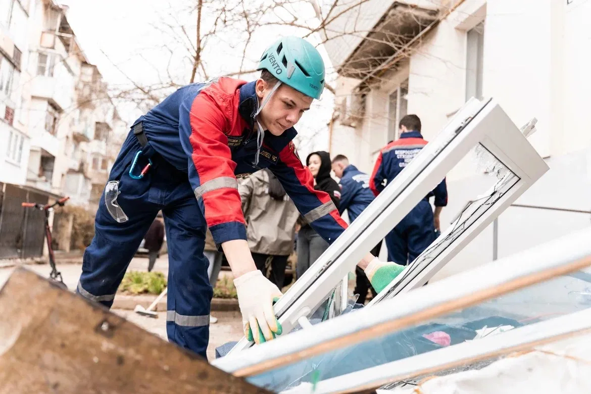 На месте работают городские службы и добровольцы ВСКС. Студенты-спасатели убирают осколки и строительный мусор.