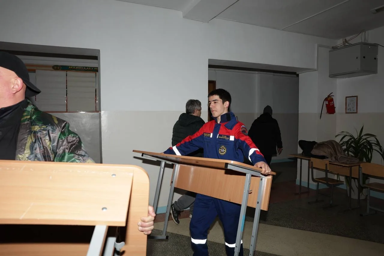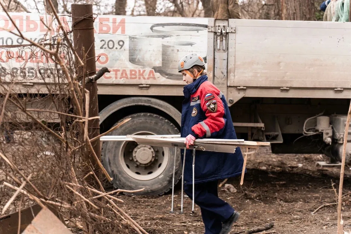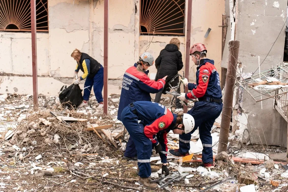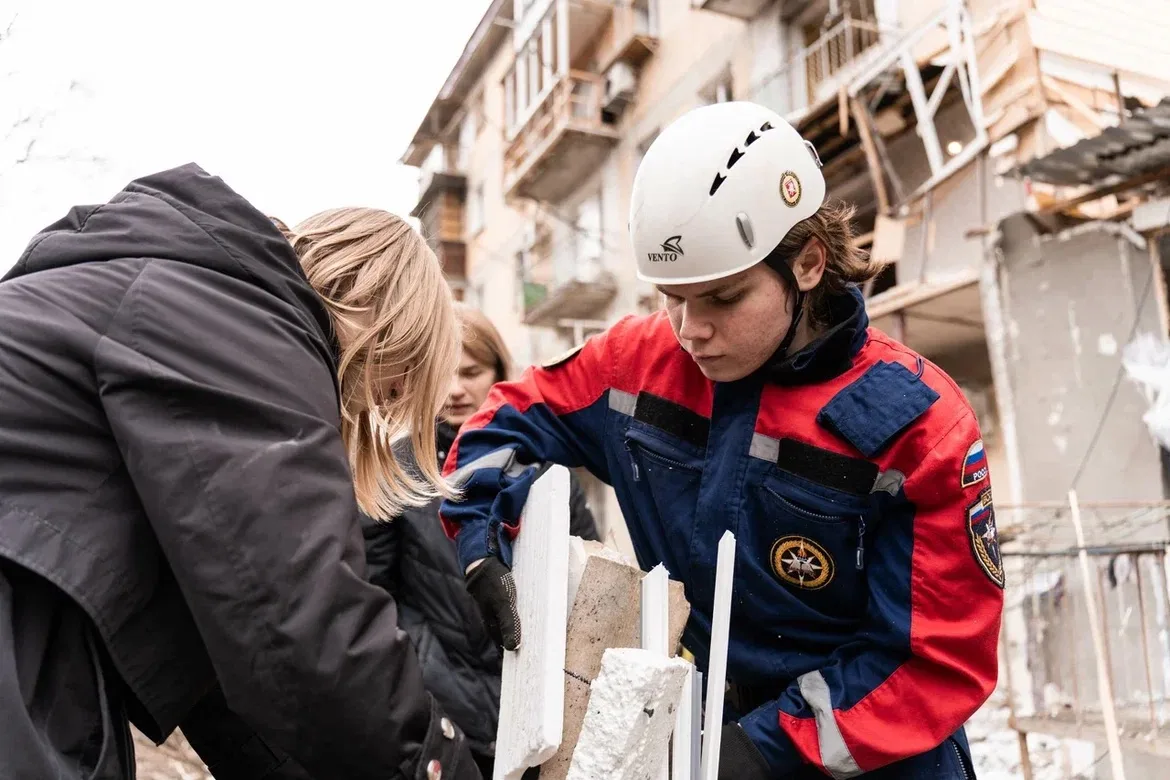 На месте работают городские службы и добровольцы ВСКС. Студенты-спасатели убирают осколки и строительный мусор.