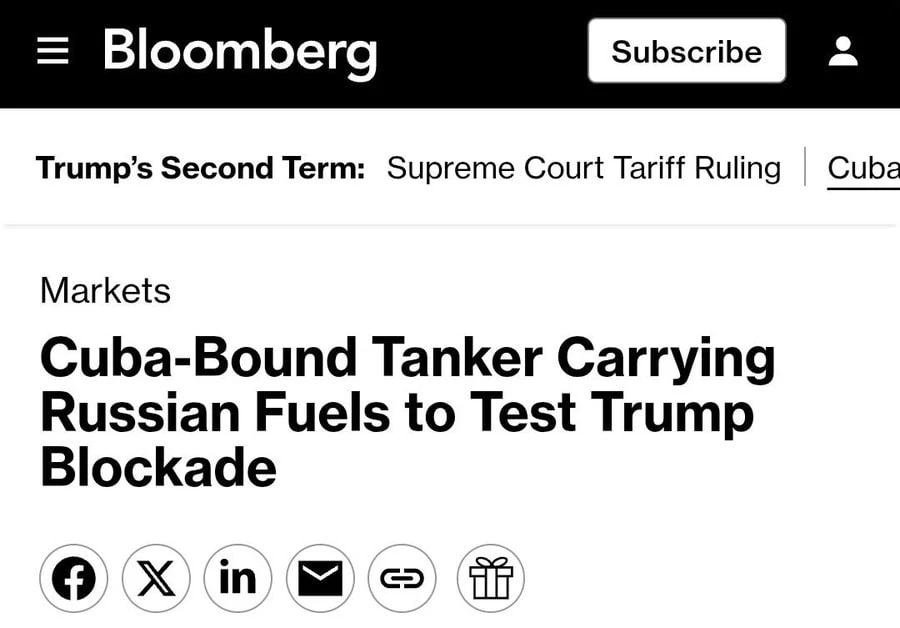 Судно, предположительно перевозящее российское топливо, направляется на Кубу, что напрямую проверяет на прочность санкции, введенные Трампом, на фоне обострения энергетического кризиса на острове. - Bloomberg