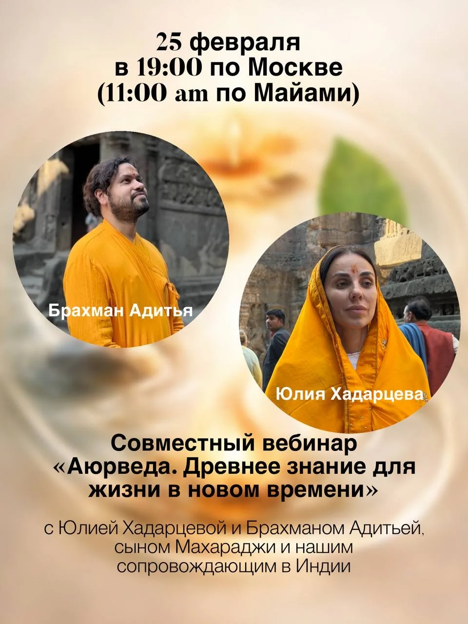 25 февраля в 19:00 по Москве (11:00 am по Майами, 21:30 по времени в Индии) я проведу совместный вебинар «Аюрведа. Древнее знание для жизни в новом времени» с Брахманом Адитьей, сыном Махараджи и нашим сопровождающим в Индии на тренингах.