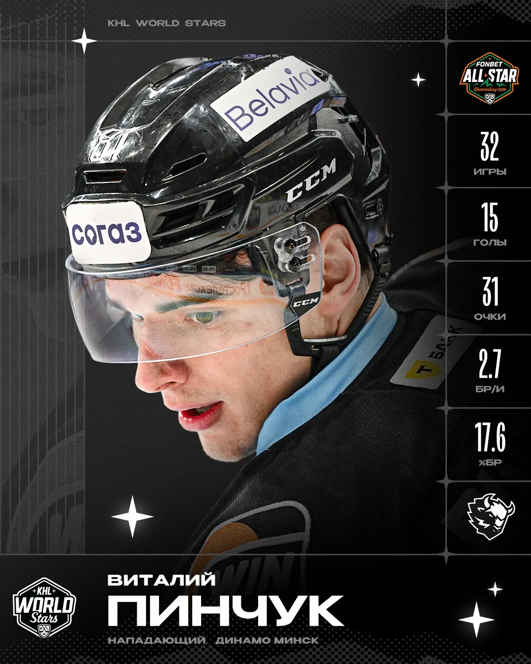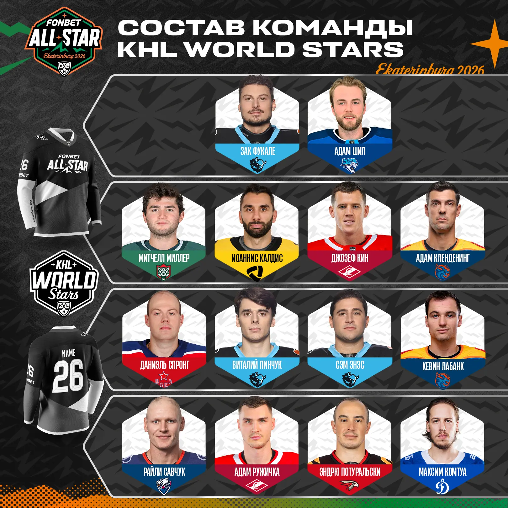За команду KHL World Stars сыграют легионеры, выступающие в клубах КХЛ, а также белорус Виталий Пинчук.
