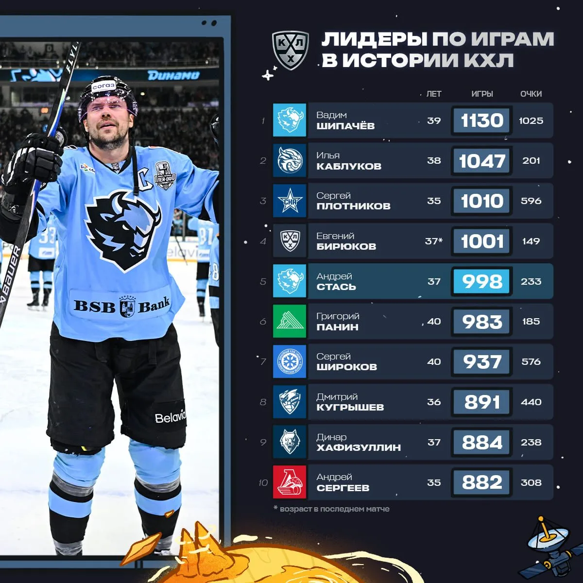 Во втором матче второго раунда капитан минского «Динамо» Андрей Стась достигнет отметки в 1000 игр в КХЛ!