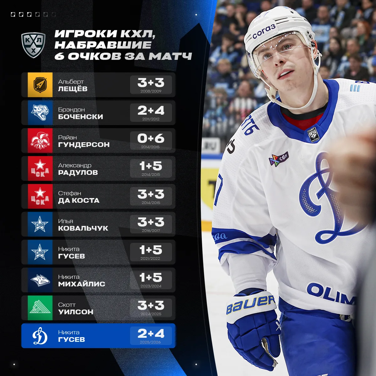 Никита Гусев стал первым игроком в истории КХЛ с двумя 6-очковыми матчами.
