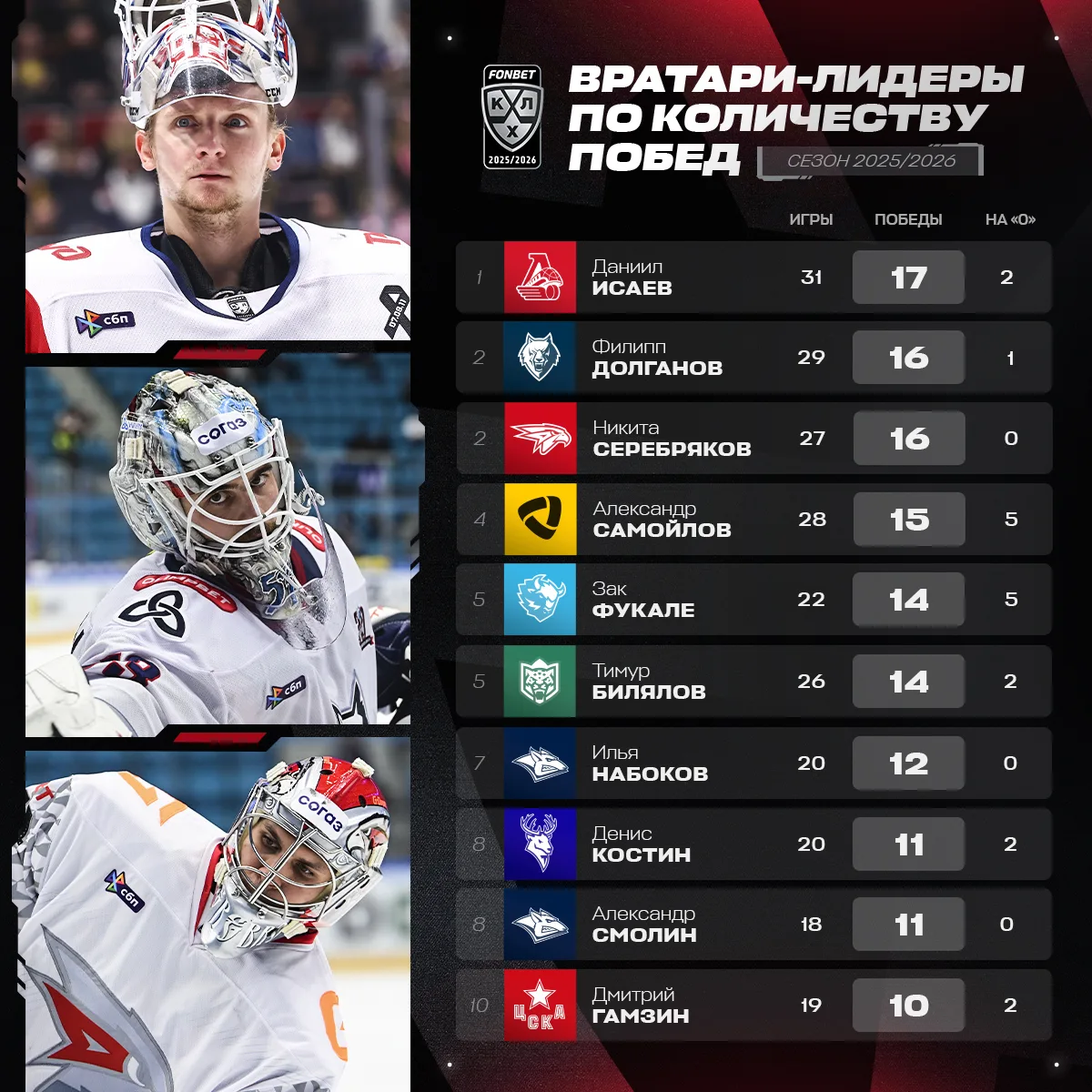 Третий сезон подряд Даниил Исаев лидирует в КХЛ по количеству побед.