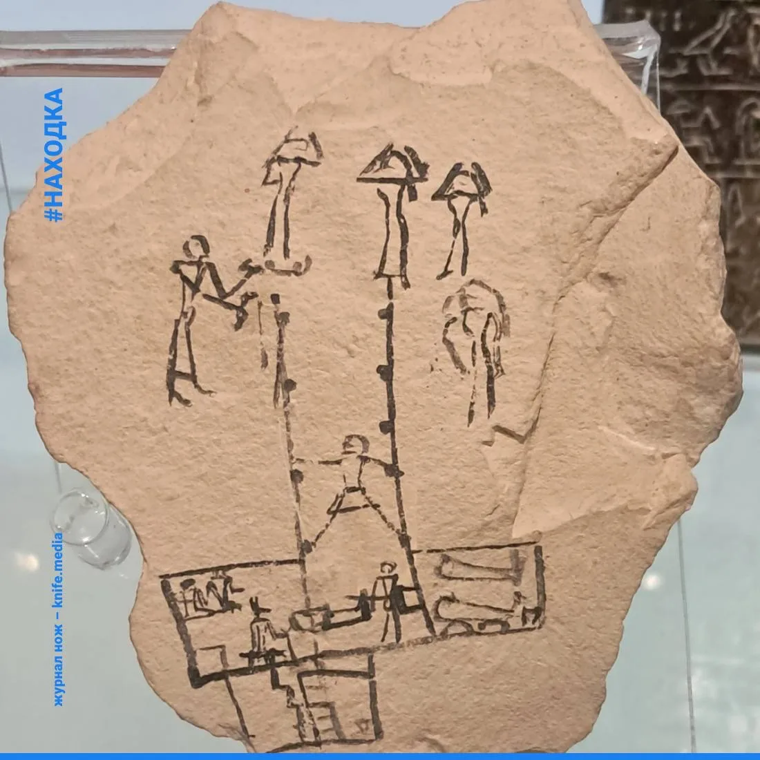 На большинстве других остраков пишут пустые заметки, оставляют квитанции или делают быстрые наброски, но на этом изобразили целую сцену похорон. На рисунке показана вертикальная шахтная гробница с гробом, помещенным в погребальную камеру.
