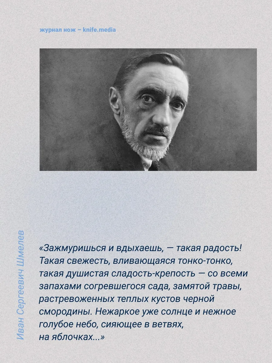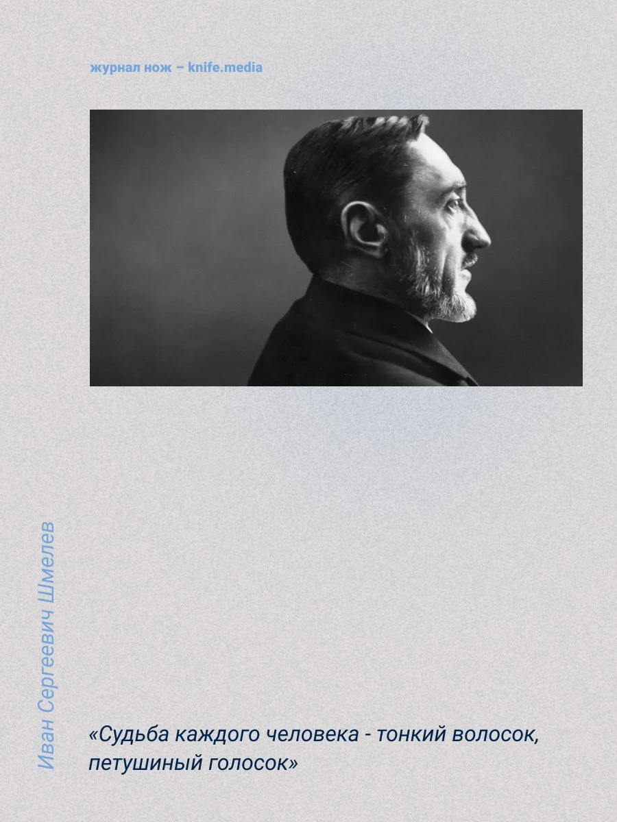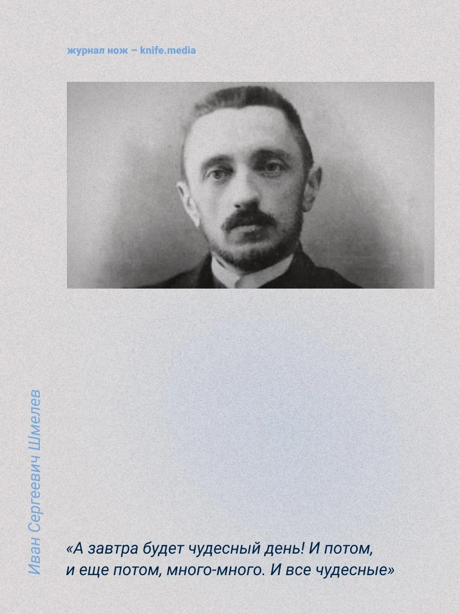 Сегодняшний именинник любил трудиться и был человеком твёрдых убеждений и принципов. К литературе питал особую любовь ещё с юношества, при чём его учителем был дядя Марины Цветаевой. Он быстро разглядел талант в своём ученике. Шмелёв писал и фантастику: рассказ про путешествие учителей на воздушном шаре на Луну передавали в школе из рук в руки.