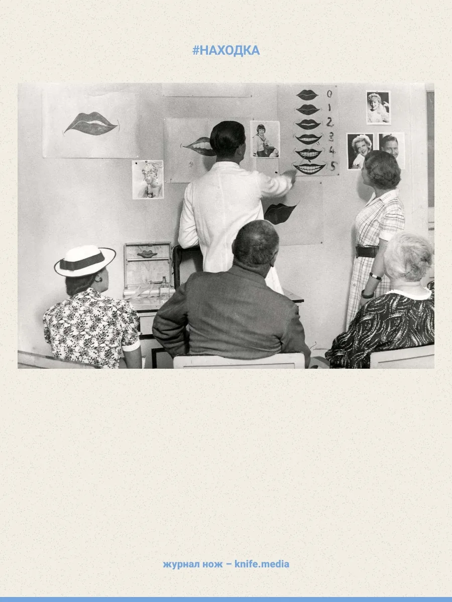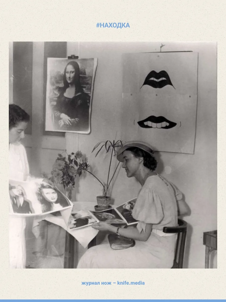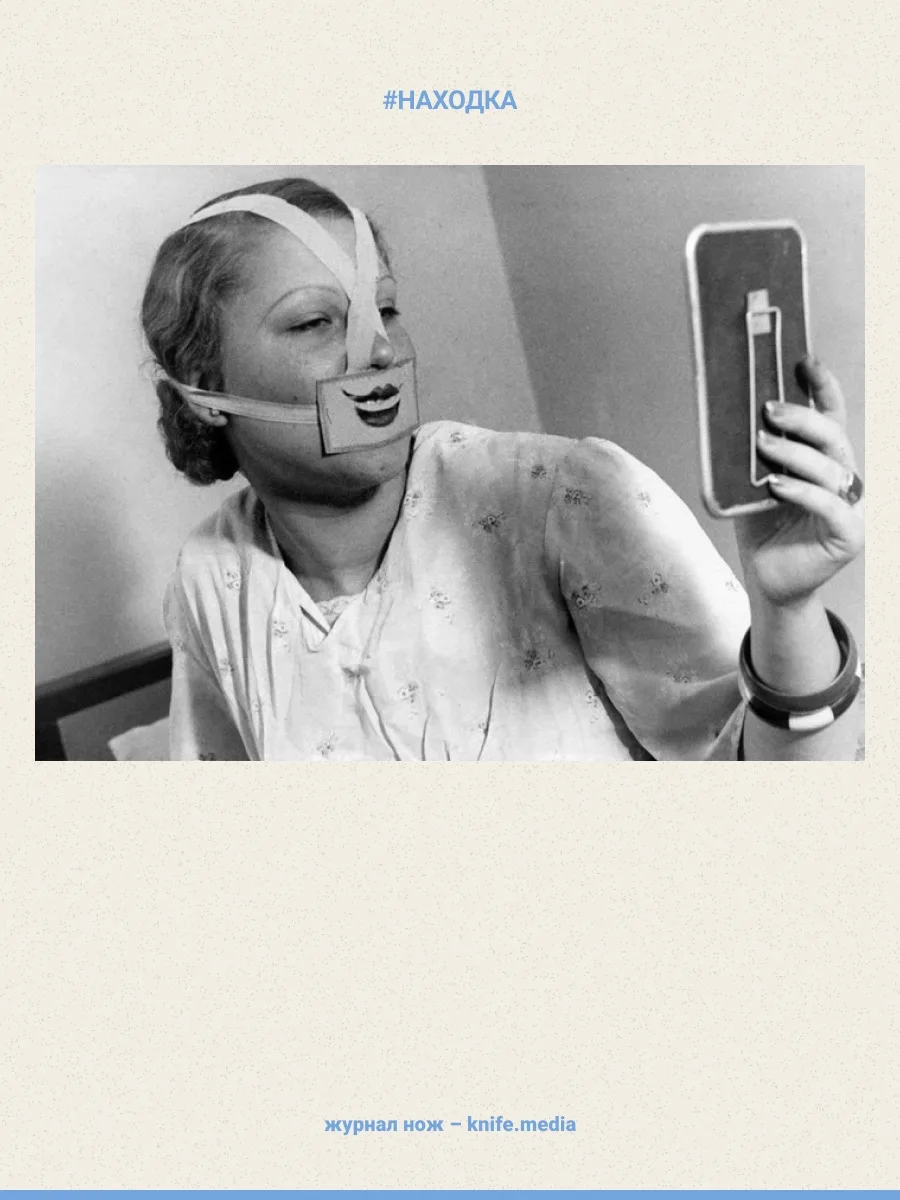На ней женщина примеряет якобы маску от депрессии. На самом деле в Будапеште 1937 года пользовалась популярностью Школа улыбок.