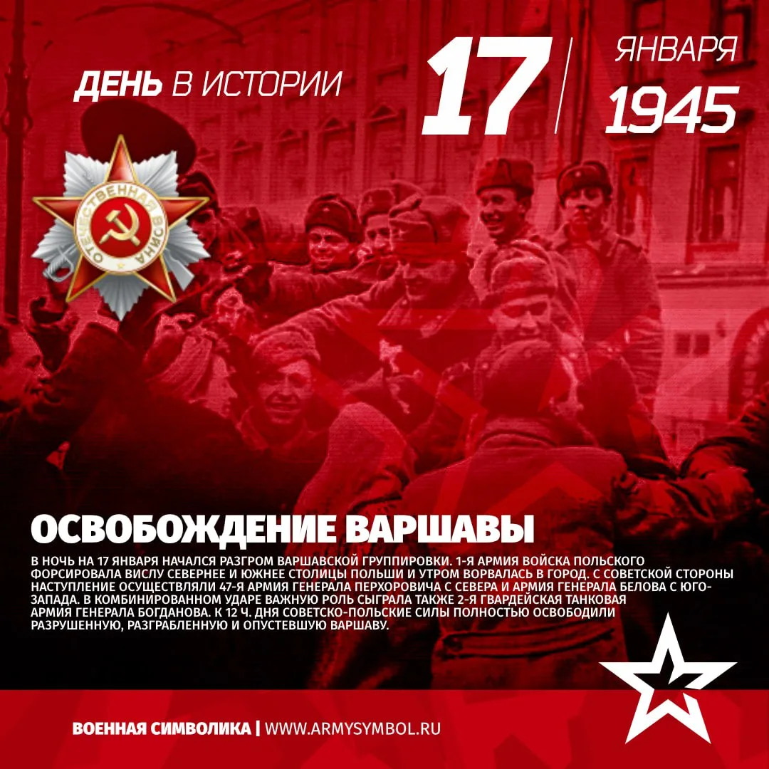 • 1945 - освобождение Варшавы частями 1-го Белорусского фронта при содействии 1-й армии войска польского от немецких оккупантов.