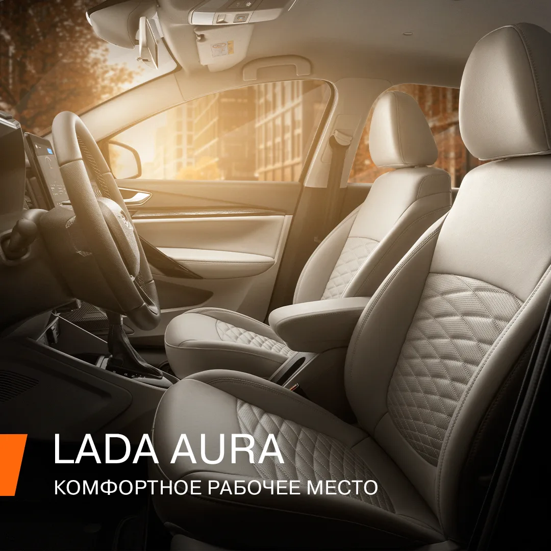 Кстати, о цветных вставках. Двухцветная оплётка руля — чёрная снаружи и белая внутри — стала уникальной чертой LADA Aura. У других моделей такого нет — в этой машине многое применено впервые. Настолько большой салон, что пассажиры любого роста могут удобно вытянуть ноги. Настолько высокий уровень оснащения: в топ-версиях сиденья обиты натуральной кожей чёрного или светло-серого цвета. И впервые — настолько красиво оформленное рабочее место водителя. В особой цветовой гамме, с хромированными накладками на педалях и порогах…